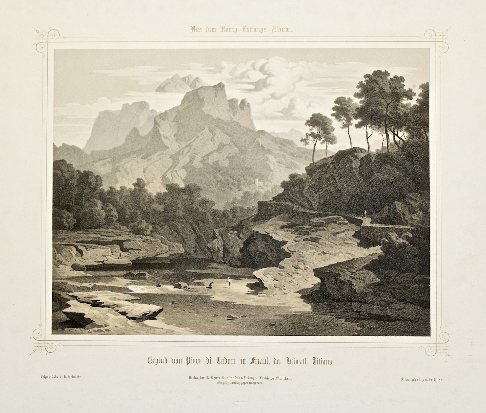 Litografia eseguita da Fr. Hohe su soggetto da Heinlein, 265x350, tratto dal "Koenig-Ludwig Album". Bella veduta raffigurante un paesaggio cadorino. Splendido esemplare.