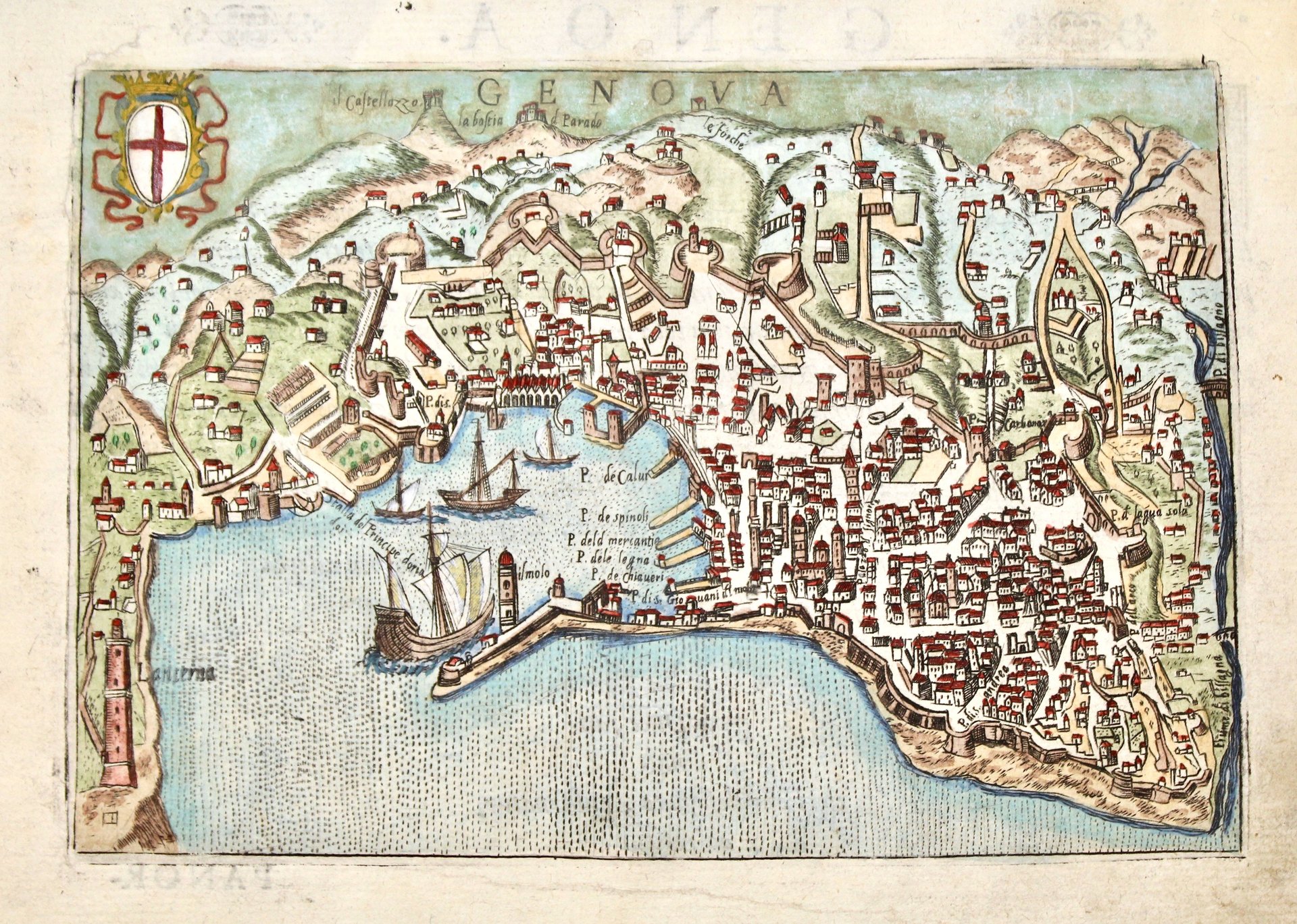 Incisione in rame, dipinta a mano, mm 120x173. Tratta da "Theatrum urbium Italicarum" prima edizione di questa raccolta di piante e vedute di città (senza dubbio da preferire per freschezza di stampa delle lastre alla successiva), ristampata successivamente a Vicenza nel 1616 da Domenico Amadio con l'aggiunta di alcune tavole (67 tavole invece delle 59 originali). Testo latino al verso, di autore ignoto, anche se alcuni studiosi ipotizzano sia dello stesso Bertelli. Ottimo esemplare.