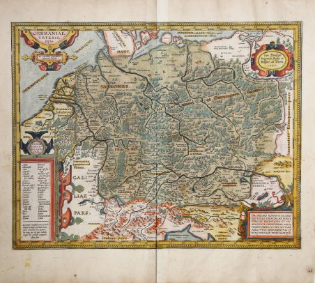 Splendida carta storico-geografica della Germania pubblicata nel ' Parergon ' di Abraham Ortelius. Esemplare dalla rara edizione italiana del Theatrum Orbis Terrarum stampata ad Anversa da Jean Baptiste Vrients nel 1608 e quindi nel 1612. In alto a sinistra il titolo: GERMANIAE | VETERIS | "typus. ' Seguito da: Ex conatibus geographicis | Abrah. Ortelij. Nel cartiglio in alto a destra il privilegio decennale: Cum Priuilegio | Imperiali, Regio, et | Belgico, ad decenn. | 1587. Nel cartiglio in basso a destra la dedica all’erudito calvinista Jacob Monau (lat. Jaconus Monavus): DN. IACOBO MONAVIO SILESIO | PATRICIO VRATISLAVIENSI, | VIRO ET ERVDITIONE ET HV:|MANITATE ORNATISSIMO, ABRA:|HAMVS ORTELIVS HOC MVTVÆ | AMICITIÆ MONVMENTVM LI:|BENS DONABAT DEDICABATQVE. Jacob Monau (Breslau, 1546 – ivi, 1603), consigliere ducale di Liegnitz-Brieg del duca Gioacchino Federico di Brieg e uno dei più famosi studiosi del suo tempo. L'educazione universale, la modestia senza pretese, la profonda religiosità gli fecero conquistare il cuore dei suoi coetanei e degli studiosi, e i suoi legami con gli uomini più famosi di quasi tutta Europa lo resero il centro attorno al quale si muoveva la vita letteraria della Slesia dell'epoca. In basso a sinistra, nel cartiglio, i luoghi di incerta localizzazione, su due colonne e, alla fine la precisazione che i luoghi sorti all’epoca di Carlo Magno non sono stati inclusi tra i nomi antichi e non sono stati riportati: “Locorum vocabula circa Caroli | Magni tempora prima nata,| inter vetusta non numero.| ea itaque nec in ipsa tabula | neque hîc seorsum nominare | visum fuit”. Affascinate carta storico-geografica della Germania antica, con particolare riferimento alle divisioni tribali del periodo imperiale romano. Disegnata da Ortelius sulla base dei testi di Tacito, Cesare, Dionisio, Tolomeo, Svetonio, Eutropio, Seneca, Plinio e Strabone. La carta è ricca di dettagli di interesse antiquario, con l'elenco delle numerose tribù e insediamenti germanici. La maggior parte della regione è coperta dalla massiccia Selva Ercinia che originariamente collegava le famose foreste d'Europa, tra cui le Ardenne, la Foresta Nera, il massiccio del Giura, i Vosgi e la foresta di Teutoburgo. Gran parte del testo sul verso della mappa fu utilizzato anche per l'opuscolo di Ortelius "Aurei Saeculi Imago", apparso nel 1596 come pubblicazione separata (di cui furono stampate 500 copie) che descrive caratteristiche e costumi dei Germani in epoca romana. Esemplare nel suo secondo stato, che differisce dal primo solo per dettagli superficiali, come l'inclusione dei numeri dei gradi all'interno del bordo, anziché all'esterno, e la rietichettatura della Gallia in basso a sinistra. Bertius acquistò un certo numero di esemplari di questa mappa e la incluse nel suo storico atlante Theatrum Geographiæ Veteris del 1618. Circa una decade dopo la pubblicazione del “moderno” Theatrum Orbis Terrarum, Ortelius rispose alle “preghiere di amici e studiosi di storia antica, sacra e profana” e compilò una serie di mappe di soggetto biblico e classico, quasi tutte disegnate da lui. Intitolò l’opera “Parergon theatri”, ovvero “aggiunta, appendice, del Theatrum”, ma al tempo stesso anche complementare al Theatrum: il Paregon theatri forniva per il mondo antico lo stesso materiale che Ortelius aveva fornito per il mondo moderno con il Theatrum: carte geografiche. Lo spirito del Parergon è tutto riassunto nel motto historiae oculus geographia riportato sul frontespizio: la geografia è l’occhio della storia. Le mappe del mondo antico avevano lo scopo di “rendere più chiari gli storici antichi e i poeti”. Le mappe del Paregon sono di tre tipologie: antiche regioni; carte letterarie e carte bibliche. Come sottolinea Koeman “il Parergon deve essere considerato come lavoro personale di Ortelius. Per quest'opera, infatti, diversamente dal Theatrum, non copiò le mappe di altri cartografi, ma ne d. Wonderful historical map of Germany published in Abraham Ortelius' Parergon. Example from the rare Italian edition of Theatrum Orbis Terrarum printed in Antwerp by Jean Baptiste Vrients in 1608 and then in 1612. Title in the cartouche at the top left: GERMANIAE | VETERIS | "typus. | Ex conatibus geographicis | Abrah. Ortelij". Cartouche upper right: "Cum Priuilegio | Imperiali, Regio, et | Belgico, ad decenn. | 1587". Cartouche bottom right: DN. IACOBO MONAVIO SILESIO | PATRICIO VRATISLAVIENSI, | VIRO ET ERVDITIONE ET HV:|MANITATE ORNATISSIMO, ABRA:|HAMVS ORTELIVS HOC MVTVÆ | AMICITIÆ MONVMENTVM LI:|BENS DONABAT DEDICABATQVE. [Abraham Ortelius freely dedicates and donates this monument in mutual friendship to Lord Iacob Monavus, Patrician from Silesia, a gentleman with the most splendid erudition as well as humanity]. Jacob Monau (Breslau, 1546 – ivi, 1603) also known as Jacobus Monavius or Iacobus Monaw, was a polymath (lawyer, linguist and poet) and leader of the Reformed Protestant faction after Johannes Crato von Krafftheim's death. In 1590 he was Councilor of Duke Frederick of Legnica and Brzeg. His universal education, unpretentious modesty, and deep religiosity won him the hearts of his peers and scholars, and his connections with the most famous men in almost all of Europe made him the center around which the literary life of Silesia at the time was moving. Cartouche bottom left: DVBIÆ | POSITIO:|NIS QVÆ:/DAM. [Places of uncertain location] (followed by a two-column list. At the bottom of this list: "Locorum vocabula circa Caroli | Magni tempora prima nata, | inter vetusta non numero.| ea itaque nec in ipsa tabula | neque hîc seorsum nominare | visum fuit". [Placenames which first arose around the times of Charles the Great, which I do not include among the ancient placenames, nor are they shown here]. Map of ancient Germania, with particular reference to its tribal divisions during the Roman imperial period, made by Ortelius on the basis of the writings by the a