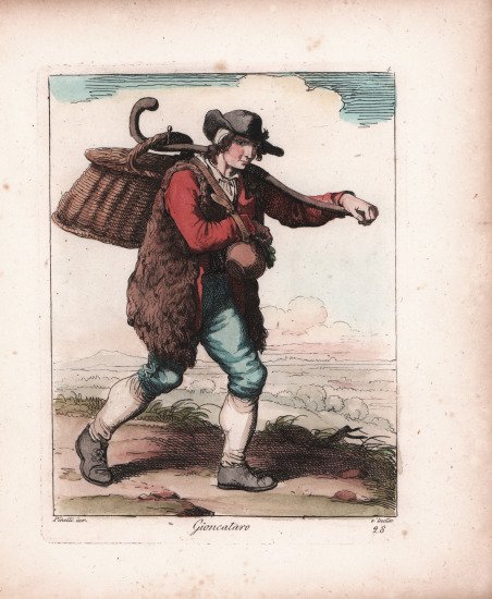 Costume popolare tratto dalla ' Nuova Raccolta di cinquanta motivi pittoreschi e costumi di Roma, 1810. Rara e bella serie, la seconda prodotta dall'artista, raffigurante costumi popolari singoli e in gruppo, scene e mestieri non solo di Roma e dintorni, ma anche di Campania, Calabria e Abruzzi. Stampatore, pittore, scultore e disegnatore italiano. Apprese i rudimenti della scultura dal padre, artigiano di piccole statuette religiose di scarso valore. Questo apprendistato in tenera età incoraggiò Pinelli ad enfatizzare la plasticità e l’espressione rispetto ai valori del Neo-Classicismo, predominanti a Roma. Purtroppo, sono pervenute fino a noi solo pochi esemplari delle sue sculture in terracotta, mentre conosciamo il volume di acqueforti, Gruppi pittoreschi (Roma, 1834), con rappresentazioni di popolani. L’enfasi sul naturalismo e su soggetti di vita quotidiana è di nuovo evidente. Sebbene avesse studiato presso l’Accademia di Belle Arti a Bologna, sostenuto economicamente dal Conte Lambertini, il nipote di Papa Benedetto XIV, Pinelli non aveva interesse a seguire l'iter tradizionale del successo artistico attraverso i soggetti religiosi. Di ritorno a Roma, alla fine del XVIII secolo, decise di vendere le sue opere nei caffè frequentati dai turisti. ' Incisione in rame, finemente colorata a mano, in ottimo stato di conservazione. Popular costume from ' Nuova Raccolta di cinquanta motivi pittoreschi e costumi di Roma, 1810. Rare and beautiful series, the second produced by the artist, depicting individual and group popular costumes, scenes and crafts not only of Rome and its surroundings, but also of Campania, Calabria and Abruzzi. Italian printmaker, painter, sculptor and draughtsman. He learnt the rudiments of sculpture from his father, a maker of cheap religious statuettes. This early training encouraged Pinelli to emphasize plasticity and expression over the Neo-classical values prevalent in Rome. Although only a few of his terracotta figures survive however, he did produce a volume of etchings, Gruppi pittoreschi (Rome, 1834), depicting rustic groups. Its emphasis on naturalism and everyday subject-matter is also characteristic of his sculptures. Although he studied both at the Accademia di San Luca in Rome and at the Accademia di Belle Arti in Bologna, helped financially by Conte Lambertini, Pope Benedict XIV’s nephew, Pinelli was not interested in pursuing the traditional path to artistic success via religious or history painting. On returning to Rome in the late 1790s he chose to peddle his works at the cafés frequented by tourists. Copperplate, finely hand coloured, in excellent condition. Cfr.