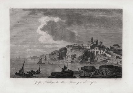 Veduta pubblicata nel ' Voyage Pittoresque ou description des Royaumes de Naples et de Sicile, opera in 5 volumi per la prima volta stampati a Parigi tra 1781 e il 1786. Richard de Saint-Non conobbe, durante il suo viaggio a Roma, i due già celebri pittori francesi Jean Honoré Fragonard e Hubert Robert, con i quali prosegue il suo viaggio per tutto il paese. Da questa grande amicizia nasce l’idea e la collaborazione per l’ambizioso progetto di documentare graficamente tutti i principali monumenti dell’Italia Meridionale e della Sicilia. Da qui, tra il 1781 ed il 1786, con l’aiuto di numerosi ed importanti architetti, pittori ed incisori, venne alla luce il Voyage Pittoresque ou description des Royaume de Naples et de Sicilie, opera composta di cinque volumi che uscirono annualmente. Incredibile sforzo tipografico, l’opera raccoglie quasi per intero gli appunti di viaggio del Saint-Non, adeguatamente assemblati e corretti; il corpus grafico è composto di ben 542 incisioni all’acquaforte e bulino, opera dei principali artisti di riproduzione del periodo. Da un punto di vista editoriale l’iniziativa riscuote immediatamente un grandissimo successo: il libro diviene un vero e proprio modello tipografico, sul quale sono basate diverse pubblicazioni dell’impero napoleonico. Dal punto di vista artistico le vedute, i paesaggi e le rovine conservano, e non può essere altrimenti, lo stile pittorico e romantico del Fragonard, del Robert, del Desprez, e di tutti gli altri artisti che collaborano nella realizzazione di questa monumentale opera. Il notevole successo commerciale della raccolta è testimoniato dalla ristampa, tra il 1795 ed il 1798, delle sole tavole pittoriche. Un’ulteriore edizione è stampata nel 1829 dal Dufour. Esemplare tratto dal ' Voyage Pittoresque, ' seconda edizione del 1795/98, priva dell’indicazione del privilegio reale. ' Acquaforte, stampata su carta vergata coeva, leggere ossidazioni, per il resto in ottimo stato di conservazione. View taken from the Voyage Pittoresque ou description des Royaume de Naples et de Sicilie by Richard de Saint-Non. During his trip to Rome, Richard de Saint-Non met two already famous French painters, Jean Honoré Fragonard and Hubert Robert, with whom he travelled along Italy. Their friendship led to the cooperation for the ambitious project of depicting all the main monuments of Southern Italy and Sicily. Between 1781 and 1786, with the assistance of many contemporary artists, he realized the Voyage Pittoresque ou description des Royaume de Naples et de Sicilie, a five volumes work published annually. As a result of a great typographical effort, the work is a collection of Sain-Non’s travelling notes; the graphic part is made up of 542 engravings and etchings, realized by the most important artists of the period. The work is immediately successful, for the book became a new typographical model for the following publications. From an artistic point of view, the views, landscapes and antiquity keep the Romantic pictorial style of Fragonard, Robert, Desprez and all the other artists that took part in this monumental project. The re-issue, between 1795 and 1798, of the pictorial plates, witnesses the great success of this project. A re-issue of the whole work was edited in 1829 by Dufour. ' Example taken from the second edition of the work, printed in Paris 1795/98; the plates are without the Royal priviledge. ' Etching, printed on contemporary laid paper, light foxing, otherwise good condition. Cfr.