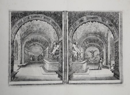 Acquaforte, monogrammata in lastra in basso. Foglio 4 della serie di 6 acqueforti che compongono l’intera Veduta della Villa medicea di Pratolino. Magnifica prova, impressa su carta vergata coeva, con margini, in perfetto stato di conservazione. L’opera fu realizzata dopo la morte di Lorenzo de’ Medici (1648), quando Della Bella decise di rientrare a Firenze, dove riprese la sua attività per la corte realizzando anche vedute di ville e altri luoghi medicei. La villa medicea fu fatta edificare da Francesco I de’ Medici, tra il 1569 e il 1581, per il soggiorno della sua seconda moglie, Bianca Cappello. Fu, poi, demolita nel 1822, ma il parco in cui sorgeva fu acquistato dalla famiglia russa dei Demidoff, che fece trasformare il superstite edificio dell’epoca medicea della Paggeria nell’attuale Villa Demidoff. L’incisione raffigura la grotta denominata di Pan. Così Bernardo Sansone Sgrilli nella sua Descrizione della regia villa, fontane et fabriche di Pratolino, del 1742: “Dalla parte destra all’entrare grotta si vede nella testata la fama che mano una tromba d oro se la pone e suona e nell’istesso tempo batte l’ali […] Sull’altra testata opposta vi è un satiro figurato per il Dio Pane che suona dolcemente la zampogna composta di sette canne.” Stefano della Bella fu uno degli incisori più interessanti e originali nella Firenze del XVII secolo e può considerarsi l’unico geniale continuatore dell’opera di Jacques Callot. La sua educazione artistica ebbe inizio a Firenze nella bottega degli orafi Gasparo Mola e Orazio Vanni, e la precisione del segno, tipica dell’arte orafa resterà caratteristica del suo stile. Studiò poi presso Giovanni Battista Vanni e forse anche presso il Cantagallina e Cesare Dandini, ma ben presto si dedicò all'incisione. Il suo vero maestro può considerarsi Jacques Callot, l’incisore francese che soggiornò a lungo a Firenze lasciando una forte impronta nel panorama artistico della città. Gli anni più importanti della sua carriera sono quelli che trascorre a Parigi, dal 1639 al 1650, stipendiato da Lorenzo de' Medici: lavorò insieme ad Israel Silvestre, con gli editori Langlois, Ciartres e Pierre Mariette, per stampatori francesi e per commissioni di gran prestigio, come quelle del 1641 per il cardinale Richelieu che gli affidò le illustrazioni delle sue imprese guerresche. Intorno al 1647, durante un viaggio in Olanda, dove eseguì le acqueforti con le vedute del porto di Amsterdam, incontrò Rembrandt e da quella data notiamo una eco profonda dell’arte dell’olandese nella grafica del Della Bella. ' Magnifico esemplare. Bibliografia Salamon, Stefano Della Bella, n. 161; De Vesme-Massar, Stefano Della Bella: Catalogue Raisonné, 841. Etching, monogrammed in the plate at the bottom. Sheet 4 of the series of 6 etchings that make up the entire View of the Villa Medici Pratolino. Magnificent proof, on contemporary laid paper, with margins, in excellent condition. The work was carried out after the death of Lorenzo de 'Medici (1648), when Della Bella decided to return to Florence, where he resumed his work for the court also realizing views of the Medici villas and other places. The Medici villa was built by Francesco I de 'Medici, between 1569 and 1581, for the stay of his second wife, Bianca Cappello. It was later demolished in 1822 but the park in which it stood was later bought by the Russian family of Demidoff who made the surviving building from the turn of the Medici in the current Paggeria Villa Demidoff. Stefano della Bella was one of the most interesting and original engravers in 17th-century Florence and can be considered the only brilliant continuator of Jacques Callot's work. His artistic education began in Florence in the workshop of the goldsmiths Gasparo Mola and Orazio Vanni, and the precision of sign, typical of the goldsmith's art, will remain characteristic of his style. He then studied under Giovanni Battista Vanni and perhaps also under Cantagallina and Cesare Dandini, but soon turned to engraving. His real master can be considered Jacques Callot, the French engraver who stayed in Florence for a long time and left a strong imprint on the city's artistic scene. The most important years of his career were the ones he spent in Paris, from 1639 to 1650, salaried by Lorenzo de' Medici: he worked together with Israel Silvestre, with the publishers Langlois, Ciartres and Pierre Mariette, for French printers and for commissions of great prestige, such as those of 1641 for Cardinal Richelieu, who entrusted him with illustrations of his warlike exploits. Around 1647, during a trip to Holland, where he executed etchings with views of the port of Amsterdam, he met Rembrandt, and from that date we note a profound echo of the Dutchman's art in Della Bella's graphic work. Bibliografia Salamon, Stefano Della Bella, n. 161; De Vesme-Massar, Stefano Della Bella: Catalogue Raisonné, 841. Cfr.