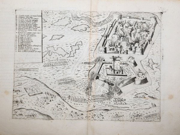 Rara pianta prospettica della città di Paolo Forlani. Esemplare della tiratura di Bolognino Zaltieri, con il testo descrittivo al verso di Giulio Ballino, stampata a Venezia nel 1569. “In alto al centro è impresso il titolo: GUINES. Nel riquadro a sinistra troviamo una legenda alfabetica di 24 rimandi (A-Z, AA). Orientazione nei quattro lati al centro con le lettere iniziali dei venti, il nord è in alto (levante e ponente invertiti Carta anonima e priva di dati editoriali attribuita a Paolo Forlani. L’opera è infatti inserita in ben quattro delle cinque copie conosciute della raccolta Il primo libro delle citta et fortezze del mondo. La tavola è altresì presente in alcune raccolte cinquecentesche di grande formato, come quelle conservate alla Marucelliana di Firenze e alla Casanatense di Roma. La rappresentazione si riferisce all’assedio di Guines del 1558 e deriva dal modello stampato a Roma dalla tipografia Lafreri. Tuttavia, la legenda differisce in alcuni rimandi e ne contiene uno in più. La lastra è ristampata da Bolognino Zaltieri per le due diverse edizioni dell’opera De’ disegni delle più illustri citta, et fortezze del mondo di Giulio Ballino, entrambe pubblicate a Venezia nel 1569. Non si hanno varianti di lastra, ma le tirature dello Zaltieri presentano un testo descrittivo al verso.” (cfr. Cartografia e topografia italiana del XVI secolo, p. 1040). Paolo Forlani, nativo di Verona, nel 1560 aprì una propria bottega calcografica a Venezia, Al segno del pozzo, come risulta da alcune sue opere. Dal 1566 è attivo a Merzaria al segno della colonna e dal 1569 a Merzaria al segno della nave. Forlani ebbe rapporti commerciali con i maggiori editori di materiale cartografico del tempo, tra questi Antonio Lafreri, la famiglia Bertelli ed altri. Oltre ad essere un talentuoso incisore, era altresì rapido nell’esecuzione, qualità che gli consentì di lavorare contemporaneamente per editori diversi, e di eseguire una gran quantità di lavori. Woodward attribuisce a Forlani circa cento opere, di cui la maggior parte però non sono firmate. Tra il 1560 e il 1567, Forlani collaborò con Ferrando Bertelli, per cui incise una decina di rami, con Camocio, Bolognino Zaltieri e con Claudio Duchetti, per il quale incise alcune mappe. Per la sua attività professionale fu però molto importante e preziosa la collaborazione con Giacomo Gastaldi per il quale incise tredici carte. Nel 1567 Forlani pubblicava e commerciava la sua opera Il primo libro delle città et fortezze principali del mondo, i cui rami passarono poi a Bolognino Zaltieri. È probabile che il Forlani sia morto durante la peste che si diffuse a Venezia dal 1575. Bellissima prova, impressa su carta vergata coeva, testo descrittivo al verso, consueta piega centrale, in ottimo stato di conservazione. Bibliografia S. Bifolco, F. Ronca, ' Cartografia e topografia italiana del XVI secolo, tav. 417; ' S. Bifolco, Città e Fortezze Principali del Mondo. Le prime raccolte italiane di cartografia urbana e gli isolari del XVI secolo, in “Cartografia e topografia italiana del XVI secolo”, pp. 137-152; Albert Ganado, The Forlani-Zenoi town books of 1567. A description and analysis, in “Florilegium Cartographicum. Beiträge zur Kartographiegeschichte und Vedutenkunde des 16. Bis 18. Jahrhunderts”, a cura di Peter H. Köhl e Peter H. Meurer, Lipsia, 1993, pp. 21-34; Béla Szalai, (adattamento e traduzione inglese Ivan Matkovi?), The Representation of the Hungarian Towns in Domenico Zenoi’s and Paolo Forlani’s Cartographic Work, in “Kartografija i geoinformacije”, Vol.11 (Budapest, No.18 December 2012), pp. 4-37; Vladimiro Valerio, Piante e vedute di Napoli dal 1486 al 1599. L’origine della iconografia urbana europea, Napoli, 1998; p. 40, n. 32 e p. 47, n. 16; David Woodward, Paolo Forlani: Compiler, Engraver, Printer, or Publisher? in Imago Mundi, Vol. 44 (Londra, 1992), pp. 45-64. Rare perspective view of the city by Paolo Forlani, 1567. Example issued by Bolognino Zaltieri, with descriptive text on verso by Giulio Ballino, printed in Venice in 1569. “In alto al centro è impresso il titolo: GUINES. Nel riquadro a sinistra troviamo una legenda alfabetica di 24 rimandi (A-Z, AA). Orientazione nei quattro lati al centro con le lettere iniziali dei venti, il nord è in alto (levante e ponente invertiti Carta anonima e priva di dati editoriali attribuita a Paolo Forlani. L’opera è infatti inserita in ben quattro delle cinque copie conosciute della raccolta Il primo libro delle citta et fortezze del mondo. La tavola è altresì presente in alcune raccolte cinquecentesche di grande formato, come quelle conservate alla Marucelliana di Firenze e alla Casanatense di Roma. La rappresentazione si riferisce all’assedio di Guines del 1558 e deriva dal modello stampato a Roma dalla tipografia Lafreri. Tuttavia, la legenda differisce in alcuni rimandi e ne contiene uno in più. La lastra è ristampata da Bolognino Zaltieri per le due diverse edizioni dell’opera De’ disegni delle più illustri citta, et fortezze del mondo di Giulio Ballino, entrambe pubblicate a Venezia nel 1569. Non si hanno varianti di lastra, ma le tirature dello Zaltieri presentano un testo descrittivo al verso.” (cfr. Cartografia e topografia italiana del XVI secolo, p. 1040). Paolo Forlani, a native of Verona, opened his own chalcographic workshop in Venice, Al segno del pozzo, in 1560, as reflected in some of his works. From 1566 he was active in Merzaria al segno della colonna and from 1569 in Merzaria al segno della nave. Forlani had business relationships with the major publishers of cartographic material of the time, among them Antonio Lafreri, the Bertelli family, and others. In addition to being a talented engraver, he was also quick to execute, a quality that enabled him to work for different publishers at the same time, and to execute a large amount of work. Woodward attributes about one hundred works to Forlani, most of which