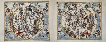 Coppia di carte celesti tratta dal celebre ' Atlas Coelestis Seu Harmonia Macrocosmica ' del Cellarius, il più importante atlante celeste mai stampato. ' ' L' ' Harmonia Macrocosmica ' venne pubblicata nel 1660 (una ristampa venne eseguita nel 1661) da Johannes Janssonius, il noto editore di Amsterdam, quale supplemento al suo ' Atlas Novus. Cellarius aveva già iniziato a lavorare a questo atlante prima del 1647, e nelle sue intenzioni doveva essere un’introduzione ad un trattato in due volumi sulla cosmografia, ma la seconda parte non venne mai pubblicata. Andreas Cellarius nacque nel 1596 a Neuhausen e fu educato a Heidelberg. Emigrò in Olanda all'inizio del XVII secolo, e nel 1637 si trasferì a Hoorn, dove divenne rettore della Scuola Latina. L’ Harmonia Macrocosmica consiste in una serie di carte celesti iniziate da Cellarius nel 1647 e destinate a far parte di un trattato di cosmografia in due volumi, che non fu mai pubblicato. Le carte di Cellarius sono le più ricercate tra le carte celesti, in quanto fondono le suggestive immagini dell'epoca d'oro della cartografia olandese con le conoscenze scientifiche contemporanee. I presenti esemplari provengono dall'edizione Valk & Schenk dell'atlante di Cellarius, che è invariata rispetto all'edizione del 1661. Le edizioni del 1660 e del 1661 possono essere distinte dall'inclusione di un numero di tavola nell'angolo inferiore destro dell'edizione del 1661. L'edizione Valk & Schenk può essere distinta facilmente per l'aggiunta del nome dello stampatore. Dal punto di vista strettamente astronomico la tavola Haemisphaerium stellatum boreale antiquum “riproduce in proiezione polare eclittica convessa le stelle, suddivise in classi di sei magnitudini e posizionate per il 1660, appartenenti al cielo boreale e visibili fino ad una latitudine di 30 ° sud. Il diametro esterno dell’emisfero è di circa ' 40,5 centimetri. Il reticolo di riferimento prevede scale graduate di un grado di unità di longitudine poste sia sull’eclittica che sulla circonferenza esterna. La linea del ' Colurus Solstitiorum ' e ' quella che passante per il Polo Eclittico collega i due punti degli equinozi sono definiti da una scala graduata con tacche di un grado di latitudine. Sono inoltre tracciati il circolo polare artico, quello del tropico del Cancro, l’equatore e l’eclittica. Oltre alle costellazioni tolemaiche sono disegnate con i loro personaggi mitologici Antinous, i fiumi Tigri, Eufrate e Giordano, Apes, Gyraffa, e le raramente rappresentate costellazioni del Cancer Minor e della Sagitta Australe” mentre la tavola Haemisphaerium stellatum australe antiquum: “riproduce in proiezione polare eclittica convessa le stelle, suddivise in classi di sei magnitudini e posizionate per il 1660, appartenenti al cielo australe e visibili fino ad una latitudine di 30 ° nord. Il diametro esterno dell’emisfero è di circa ' 40,5 centimetri. Il reticolo di riferimento prevede scale graduate di un grado di unità di longitudine poste sia sull’eclittica che sulla circonferenza esterna. La linea del ' Colurus Solstitiorum ' e ' quella che passante per il Polo Eclittico collega i due punti degli equinozi sono definiti da una scala graduata con tacche di un grado di latitudine. Sono inoltre tracciati il circolo polare antartico, quello del tropico del Capricorno, l’equatore e l’eclittica. Oltre alle costellazioni tolemaiche sono disegnate con i loro personaggi ' Cruzero, Columba Noachi, Monoceros Unicornis, le dodici costellazioni osservate dai naviganti Keiser e Houtman ed ufficializzate nell'Uranometria di Bayer del 1603, e le raramente rappresentate costellazioni del Cancer Minor, ' della Sagitta Australe e del Gallus” (cfr. F. Stoppa, Atlas Coelestis.com). Magnifiche prove, impresse su carta vergata coeva, finemente colorate a mano, con pieni margini, in perfetto stato di conservazione. A nice pair of celestial charts from ' Atlas Coelestis Seu Harmonia Macrocosmica ' del Cellarius, first published by Janssonius in 1660. ' His connection with the Janssonius publishing firm dates from around 1645. In this year Jodocus Janssonius, Johannes’s son, published Cellarius’s ' Architectura Militaris, a work on fortifications. In 1652 the Amsterdam publisher Gillis Jansz. Valckenier published Cellarius's ' Regni Poloniae … ' with 21 maps. In 1660, Joannes Janssonius added a celestial atlas to his Atlas Major, the beautiful ' Harmonia Macrocosmica ' by Andreas Cellarius. In 1661 the atlas was republished as a separate publication. The plates of the Harmonia Macrocosmica were reprinted (without the Latin commentary) in 1708 by the Amsterdam publishers Valk and Schenk. ' The ' Harmonia Macrocosmica ' is the most beautiful celestial atlas ever published and is one of the notable masterworks from the Golden Age of Dutch cartography. The first part of the atlas contains engravings depicting the world systems of Claudius Ptolemy, Nicolaus Copernicus, and Tycho Brahe. At the end are star maps of the classical and further constellations. ' Andreas Cellarius was born in 1596 in Neuhausen and educated in Heidelberg. He emigrated to Holland in the early 17th century, and in 1637 moved to Hoorn, where he became the rector of the Latin School. The work consists of a series of Celestial Charts begun by Cellarius in 1647 and intended as part of a two-volume treatise on cosmography, which was never issued. Cellarius' charts are the most sought after of celestial charts, blending the striking imagery of the golden age of Dutch Cartography with contemporary scientific knowledge. The present examples come from the Valk & Schenk edition of Cellarius' atlas, which is unchanged from the 1661 edition. The 1660 and 1661 editions can be distinguished by the inclusion of a plate number in the lower right corner of the 1661 edition. The Valk & Schenk edition can be distinguished by the addition of the printer's name (Valk & Schenk) in the titles of the maps. From a strictly astro