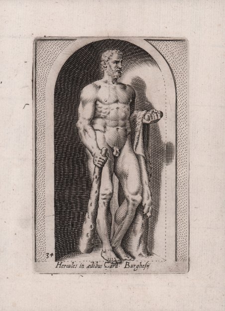 Statua di Eracle, del tipo Albertini, nel portico della Galleria Borghese (inv. CXIV). La testa, compreso il collo, è moderna e replica un ritratto di Commodo. La figura è stante sulla gamba destra, mentre la sinistra è flessa. Con la mano destra impugna la clava, nella sinistra stringe i pomi delle Esperidi. Sull’avambraccio flesso è adagiata la pelle del leone (leontè), che scende lungo il sostegno laterale. Il soggetto e l’iconografia della scultura rimandano a un modello statuario di epoca ellenistica rielaborato in età imperiale romana. Bulino, circa 1599, della serie ' ANTIQUARUM STATUARUM URBIS ROMAE LIBER PRIMUS, ideata, incisa e stampata a Roma da Philippe Thomassin. Esemplare nel primo stato di due. Philippe Thomassin fu incisore e editore, nativo di Troyes, attivo a Roma a partire dal 1585. Nel 1588 iniziò a pubblicare le sue opere. Nel 1589 iniziò la collaborazione con Jean Turpin; la loro società venne descritta nell’atto di scioglimento del 19 gennaio 1602 come devota alla ‘pratica della pittura e incisione, per l’acquisto e la vendita di incisioni stampate da loro o per loro ordine, per vendita all’estero al dettaglio e all’ingrosso.’. Nel 1590 fu arrestato e interrogato dal Santo Ufficio per un ritratto - che avrebbe inciso - di Enrico IV di Francia. Nei suoi primi anni a Roma lavorò per editori come Claudio Duchetti, Lorenzo Vaccari e Marcello Clodio. Comprò vecchie lastre, anche un gruppo dagli eredi di Aliprando Caprioli nel 1599 per il quale richiese un privilegio di 10 anni a Papa Clemente VIII nello stesso anno. Nel1603 pubblicò due incisioni di Francesco Villamena. Baglione disse che amava concentrarsi di più su soggetti religiosi, ma non in maniera esclusiva, come mostra l’importante collezione ' Antiquarum Statuarum Urbis Romae. Bellissima prova, impressa su carta vergata coeva, con margini, minime ossidazioni, per il resto in ottimo stato di conservazione. Bibliografia E. Bruwaert, ' La vie et les oeuvres de Philippe Thomassin Graveur Troyen ' (1562-1622), 1914, n. 275; The De Rossi family, 497, 534, 1993; Indice delle stampe De Rossi, 17, c. 6, 1735; Indice delle stampe De Rossi, 12, c. 2, 1677; ' L’Antiquarum Statuarum Urbis Romae fra antichità e collezionismo, in “Bollettino d'Arte” volume speciale VI serie 1995. Statue of Heracles of the Albertini type, in the porch of the Galleria Borghese (inv. CXIV). The head and neck are modern and replicate a portrait of Commodus. The figure is standing, with its weight on the right leg, while the left leg is bent. He holds a club in his right hand, and the apples of the Hesperides in his left. A lion’s skin (leontè) is draped over his bent forearm, hanging down over the side support. The subject and iconography of the sculpture point to a Hellenistic model reworked in the Roman imperial period. Engraving, circa 1599, from the series ' ANTIQUARUM STATUARUM URBIS ROMAE LIBER PRIMUS, designed, engraved, and printed in Rome by Philippe Thomassin. Example in the first state of two. Philippe Thomassin was an engraver and publisher, a native of Troyes, active in Rome from 1585. In 1588 he began publishing his works. In 1589 he began a partnership with Jean Turpin; their company was described in the act of dissolution of January 19, 1602 as devoted to 'the practice of painting and engraving, for the purchase and sale of engravings printed by them or by their order, for sale abroad at retail and wholesale.' In 1590 he was arrested and interrogated by the Sacro Offizio for a portrait-which he would engraved of Henry IV of France. In his early years in Rome he worked for publishers such as Claudio Duchetti, Lorenzo Vaccari and Marcello Clodio. He bought old plates, even a group from the heirs of Aliprando Caprioli in 1599 for which he requested a 10-year privilege from Pope Clement VIII in the same year. In 1603 he published two engravings by Francesco Villamena. Baglione said he liked to focus more on religious subjects, but not exclusively, as the important collection ' Antiquarum Statuarum Urbis Romae ' shows. Beautiful proof, printed on contemporary laid paper, with margins, minimal oxidation, otherwise in excellent condition. Bibliografia E. Bruwaert, ' La vie et les oeuvres de Philippe Thomassin Graveur Troyen ' (1562-1622), 1914, n. 275; The De Rossi family, 497, 534, 1993; Indice delle stampe De Rossi, 17, c. 6, 1735; Indice delle stampe De Rossi, 12, c. 2, 1677; ' L’Antiquarum Statuarum Urbis Romae fra antichità e collezionismo, in “Bollettino d'Arte” volume speciale VI serie 1995. Cfr.