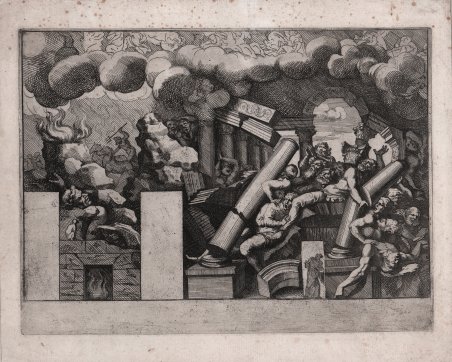 Acquaforte, 1680 circa, priva di firma. Opera tratta dalla rarissima serie "Giove che fulmina li Giganti", raffigurante gli affreschi eseguiti da Giulio Romano nella Sala dei Giganti di Palazzo Te di Mantova. Esemplare di primo stato di due, avanti l’aggiunta del numero in basso a destra. Magnifica prova, ricca di contrasto, impressa su carta vergata coeva, con margini, in perfetto stato di conservazione. “La serie del Bartoli è una interessante e importante testimonianza del «capricciosissimo ingegnoso Giulio» che in questo ciclo di affreschi ha forse voluto alludere all'atto di omaggio e sottomissione reso da Federico Gonzaga all'imperatore Carlo V, in occasione della seconda visita da lui fatta a Mantova nel 1532, e al tempo stesso fornire un monito a chiunque voglia ribellarsi ad un potere superiore. La Caduta dei Giganti è stata anche associata alla punizione di Francesco Gonzaga da Calvisano, marito di Isabella Boschetti fatto uccidere da Federico e dagli altri presenti ribelli. Alle virtù che regolano i rapporti umani, rappresentate nella camera dell'Imperatore, si contrapporrebbero dunque la temerarietà e la presunzione dei Giganti, i figli di Gea che avendo osato scalare l'Olimpo sono colpiti dai fulmini di Giove che ne causano la morte ed eterne sofferenze come appare nella parete ovest riprodotta nella penultima stampa del Bartoli dove sono rappresentati i Ciclopi annientati da Nettuno sotto l'Etna che nell'effetto illusionistico della Sala incorpora il fuoco sviluppato dal camino” (cfr. S. Massari, Giulio Romano pinxit et delineavit, p. 277). Bibliografia S. Massari, Giulio Romano pinxit et delineavit, p. 273, 270 I/II. ' Etching, 1680 circa, unlettered. Giants crushed by rocks and the falling columns of the temple, clouds of smoke above, Poseidon in his chariot to left in the background, two spaces at left for doorways, From 'Giove che fulmina li giganti', after the frescoes on the ceiling of the Sala dei Giganti designed by Giulio Romano for the Palazzo del Te, Mantua A fine impression of the first state of two, before the number, printed in contemporary laid paper, with margins, light foxing otherwise in very good conditions. “Bartoli's series is an interesting and important testimony to the ‘capricious ingenious Giulio,’ who in this cycle of frescoes perhaps wished to allude to the act of homage and submission rendered by Federico Gonzaga to Emperor Charles V on the occasion of his second visit to Mantua in 1532, while at the same time providing a warning to anyone wishing to rebel against a higher power. The Fall of the Giants was also associated with the punishment of Francesco Gonzaga da Calvisano, husband of Isabella Boschetti who was made to be killed by Federico and the other present rebels. The virtues that govern human relations, represented in the Emperor's chamber, would thus be contrasted with the temerity and presumption of the Giants, the sons of Gaea who having dared to climb Olympus are struck by Jupiter's thunderbolts that cause their death and eternal suffering as appears on the west wall reproduced in Bartoli's penultimate print where the Cyclopes annihilated by Neptune under Mount Etna are represented, which in the illusionistic effect of the Hall incorporates the fire developed by the fireplace” (cfr. S. Massari, Giulio Romano pinxit et delineavit, p. 277). Bibliografia S. Massari, Giulio Romano pinxit et delineavit, p. 273, 270 I/II. Cfr.