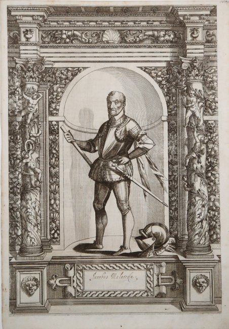 Ritratto di Giacomo Malatesta. Bulino, 1601, da Giovan Battista Fontana. Ottima prova, impressa su carta vergata coeva, con margini, in buono stato di conservazione. Testo latino al verso, prima edizione. Tavola tratta da ' Augustissimorum Imperatorum . regum . verissimae immagina… (noto anche come Armamentarium Heroicum), il catalogo della collezione di armi dell'Arciduca Ferdinando II, conservato nel castello di Ambras; venne pubblicato per la prima volta a Innsbruck nel 1601. Fu illustrato con un frontespizio e 125 ritratti di principi europei in armatura completa, inseriti in una ricca cornice ornamentale. Le lastre furono incise da Domenico Custos su disegno di Giovanni Battista Fontana. Ogni tavola era accompagnata da un breve testo biografico scritto da Jacob Schrenk von Notzing. Una traduzione tedesca del libro (di J. E. Noyse von Campenhouten) è stata pubblicata nel 1603 con il titolo Der Aller Durchleuchtigisten und Grossmächtigen Kayser, Durchleuchtigisten unnd Großmächtigen Königen[.]. Una terza edizione, comprendente 123 tavole, fu stampata a Innsbruck nel 1605. Portrait of Giacomo Malatesta, full-length, facing front, wearing armour and holding a baton in his right hand; within a niche, flanked on either side by decorated Corinthian columns. Engraving, circa 1601. A fine impression, printed on contemporary laid paper, with margins, good condition. Latin text on verso, first edition. Plate from Augustissimorum Imperatorum . regum. verissimae imagines… (also known as Armamentarium Heroicum), the catalogue of the arms collection Archduke Ferdinand II kept at Ambras castle; it was first published in Innsbruck in 1601. It was illustrated with a frontispiece and 125 portraits of European princes in full armour, with decorative surroundings. The plates were engraved by Dominicus Custos after designs by Giovanni Battista Fontana. Each plate was accompanied by a short biographical text on the former owner of the armour, written by Jacob Schrenk von Notzing. A German translation of the book (by J. E. Noyse von Campenhouten) was published in 1603 under the title Der aller Durchleuchtigisten und Grossmächtigen Kayser, Durchleuchtigisten unnd Großmächtigen Königen[.]. A third edition including 123 plates was issued in Innsbruck in 1605. Cfr. Hollstein 60.