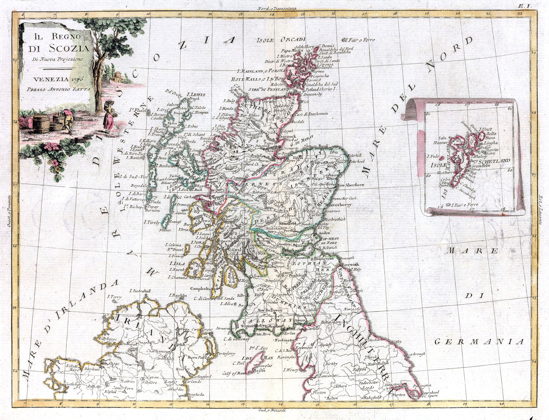 Incisione in rame, mm 300x400; colorata d'epoca su carta vergellata con marca d'acqua. Antonio Zatta (1775-1797) fu uno dei più importanti editori di carte geografiche del tardo XVIII secolo italiano. La sua opera costituisce un importante punto di passaggio tra la cartografia antica e moderna, più attenta all'accuratezza dei dettagli geografici che all'abbellimento estetico ricco di motivi mitologici o d'invenzione, come era quello dell'epoca precedente. La sua opera più importante è Atlante novissimo pubblicato tra il 1775 e il 1789. I disegni delle illustrazioni furono curate da collaboratori quali Giovanni Marco Pitteri, Anton Friedrich Busching, Pietro Antonio Novelli, ed incise da Giuliano Zuliani. Ottimo esemplare a pieni margini. <BR><BR>