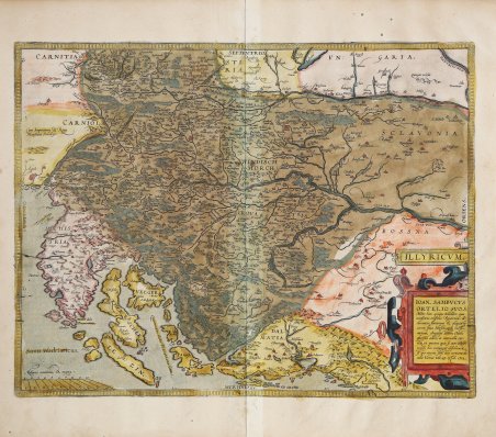 ' ILLYRICUM. IOAN. SAMBVCVS | ORTELIO SVO S. | "Mitto hanc quoque tabellam qua | neceßaria confinia Pannoniæ de:|clarantur, fluuiorum & aliquot lo:|corum situs, Hirschvogelij recte | mutaui, Angelini autem studio | plurima adieci, et interualla cor:|rexi, vt parum quis si cum Hirsch:|vogelij hæc coniungat desiderarit, | si qui errores sint, dies certiora do:|cebit, Viennæ, Vale, 25 October 1572". In alto a sinistra "Cum Imperatoriæ et Regiæ | Maiestatis Priuilegio". Come indicato nel cartiglio con il titolo, le fonti cartografiche sono la carta di Johann Sambucus del 1572, basata su quella di Hirschvogel del 1565 (Karrow 40/9.1 p. 299-300, 461, Meurer p. 227). Come indicato nel titolo, Ioannes Sambucus invia una carta accompagnata da una lettera all'amico Ortelius: “invio anche una modesta rappresentazione in cui vengono descritti i confini necessari della Pannonia, nonché la posizione dei fiumi e di alcune località. Quelli forniti da Hirschvogel li ho modificati e a quelli di Angelino ne ho aggiunti alcuni, e ho corretto alcune distanze in modo che, confrontandoli con quelli di Hirschvogel, che contengono alcuni errori, possa conoscere la verità con maggiore certezza. Vienna, addio, 25 ottobre 1572”. Mappa tratta dal Theatrum Orbis Terrarum di Abraham Ortelius, edizione italiana del 1608 stampata da Johann Baptiste Vrients. Il ' Theatrum Orbis Terrarum ' è considerato il primo vero “atlante” moderno. L’opera fu pubblicata in 7 lingue e 36 edizioni, per il quale – nel 1570 - Ortelius ottenne il ' privilegio, ovvero una sorta di diritto d'autore che impediva ad altri cartografi di pubblicare i propri lavori. Il ' Theatrum ' rappresentava il lavoro più avanzato del lavoro della descrizione cartografica. L’Ortelius vi raccolse il sapere geografico e cartografico del suo tempo, proponendo in 147 spettacolari tavole incise l’immagine più fedele del mondo allora conosciuto e, in alcune straordinarie “carte storiche”, regioni e itinerari tratti dalla letteratura, dalla mitologia, dalla tradizione. Ortelius fu anche il primo a citare le fonti, menzionando i nomi dei cartografi nel “catalogus auctorum”. Dal 1598 al 1612 le edizioni postume del ' Theatrum ' furono realizzate dal suo collaboratore Johannes Baptiste Vrients. Incisione in rame, finemente colorata a mano in epoca, in buono stato di conservazione. Bibliografia Van den Broecke, Ortelius 144; Gròf (1979) "The Map Collector" 6 p. 2-11, (1992) Cartographica Hungarica 1: pp. 26-36. Finely colored map of of Istria, Slovenia and Croatia by Abraham Ortelius. As noted in the lower right cartouche, this map was by Johann Sambucus in 1572. Map of the region from Triest and Villach in the west to Brod in the east, along the course of the Sava, centered on Zagreb and Novograd.Includes nice detail along the Dalmatian Coast, including Zara, Alt Zara and Spalato, among othe coastal towns. ILLYRICUM. IOAN. SAMBVCVS | ORTELIO SVO S. | "Mitto hanc quoque tabellam qua | neceßaria confinia Pannoniæ de:|clarantur, fluuiorum & aliquot lo:|corum situs, Hirschvogelij recte | mutaui, Angelini autem studio | plurima adieci, et interualla cor:|rexi, vt parum quis si cum Hirsch:|vogelij hæc coniungat desiderarit, | si qui errores sint, dies certiora do:|cebit, Viennæ, Vale, 25 October 1572". Upper left: "Cum Imperatoriæ et Regiæ | Maiestatis Priuilegio". The Cartographic sources is the map by Johann Sambucus 1572, based on Hirschvogel 1565 (Karrow 40/9.1 p. 299-300, 461, Meurer p. 227). As indicated in the title, Ioannes Sambucus greets his friend Ortelius. I also send a modest representation in which the necessary boundaries of Pannonia are being described, as well as the location of rivers and some places. Those provided by Hirschvogel I have changed and to those of Angelinus I have added some, and I have corrected some distances so that, when they are compared to those of Hirschvogel, which contain some mistakes, he can get to know the truth with greater certainty. Vienna, farewell, October 25, 1572. From the rare Italian edition of Abraham Ortelius' Theatrum Orbis Terrarum, 1608, published by Vrients. The ' Theatrum Orbis Terrarum ' is considered the first true modern "Atlas". The work was published in 7 languages and 36 editions, for which - in 1570 - Ortelius obtained the privilege, a kind of copyright that prevented other cartographers from publishing his works. The ' Theatrum ' represented the most advanced work of cartographic description. Ortelius collected in it the geographical and cartographic knowledge of his time, proposing in 147 spectacular engraved plates the most faithful image of the world then known and, in some extraordinary "historical maps", regions and routes taken from literature, mythology, tradition. Ortelius was also the first to cite sources, mentioning the names of cartographers in the "catalogus auctorum". From 1598 to 1612 the posthumous editions of the ' Theatrum ' were made by his collaborator Johannes Baptiste Vrients. Copperplate with fine original hand colouring, in good condition. Bibliografia Van den Broecke, Ortelius 144; Gròf (1979) "The Map Collector" 6 p. 2-11, (1992) Cartographica Hungarica 1: pp. 26-36. Cfr.
