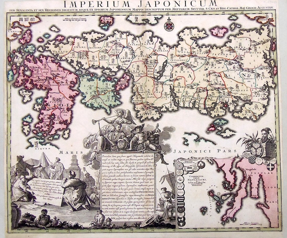 Incisione in rame, mm 465x575, con coloritura originale d'epoca. Seutter, dopo un apprendistato presso Homann a Norimberga, trasferitosi ad Augsburg verso il 1720, aprì la propria attività superando il maestro sotto il profilo della bellezza: le sue carte hanno sempre colori brillanti e cartigli elaborati. Infatti anche in questo caso l'incisione è arrichita di varie figure, edifici e ceramiche giapponesi. Il nome di ognuna delle 66 regioni giapponesi è riportato con caratteri latini e nipponici. Esemplare in ottimo stato di conservazione con insignificante ingiallimento alla giuntura dei fogli. <BR><BR>