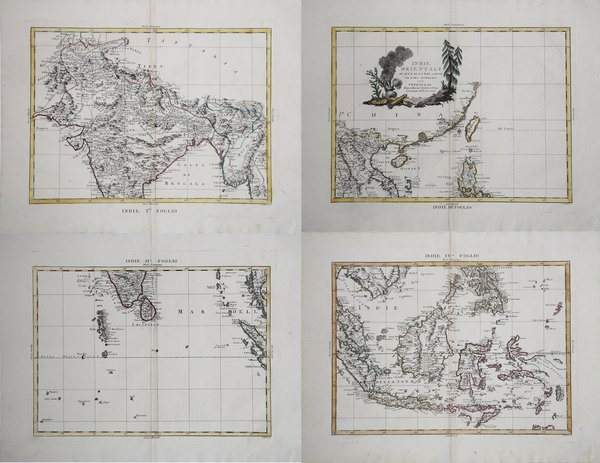Carta geografica tratta dall’Atlante novissimo, illustrato ed accresciuto sulle osservazioni e scoperte fatte dai più celebri e più recenti geografi. Stampato in quattro volumi da Antonio Zatta tra il 1779 ed il 1785. Atlante fra i più belli e completi mai pubblicati in Italia nel XVIII secolo, l'opera più famosa dello Zatta. L’Atlante Novissimo, come si specifica anche nel titolo, è “accresciuto sulle osservazioni scoperte fatte dai più celebri e più recenti geografi”. Tra le novità più significative vi è la comparsa delle nuove isole scoperte nell'Oceano Pacifico da James Cook e la prima carta italiana della Nuova Zelanda. Le illustrazioni furono ' ideate e disegnate dai suoi collaboratori Giovanni Marco Pitteri, Anton Friedrich Busching, Pietro Antonio Novelli ed incise da Giuliano Zuliani. Il primo tomo dell’atlante è introdotto da un breve saggio di geografia generale dove l’autore definisce in modo sintetico e preciso gli elementi che compongono i reticoli eclittico ed equatoriale usati nelle tavole. Interessante la sezione dove si sofferma ' a descrivere il fenomeno della precessione degli equinozi e quello della variazione ciclica dell'obliquità dell'eclittica. Acquaforte, stampata su carta vergata coeva, coloritura coeva dei contorni, in buone condizioni. Quattro fogli da 420x330 mm. Map from the Atlante novissimo, illustrato ed accresciuto sulle osservazioni e scoperte fatte dai più celebri e più recenti geografi. Printed in four volumes by Antonio Zatta between 1779 and 1785. ' Atlas among the most beautiful and complete ever published in Italy in the eighteenth century, the most famous work of Zatta. The Atlante Novissimo, as also specified in the title, is “increased on the observations made by the most famous and most recent geographers”. Among the most significant innovations there is the appearance of the new islands discovered in the Pacific Ocean by James Cook and the first Italian map of New Zealand. The illustrations were designed and drawn by his collaborators Giovanni Marco Pitteri, Anton Friedrich Busching, Pietro Antonio Novelli and engraved by Giuliano Zuliani. The first volume of the atlas is introduced by a brief essay of general geography where the author defines in a concise and precise way the elements that make up the ecliptic and equatorial grids used in the tables. Interesting is the section where he pauses to describe the phenomenon of precession of the equinoxes and the cyclical variation of the obliquity of the ecliptic. Etching, printed on contemporary laid paper, contemporary outline coloring, in good condition. Cfr.