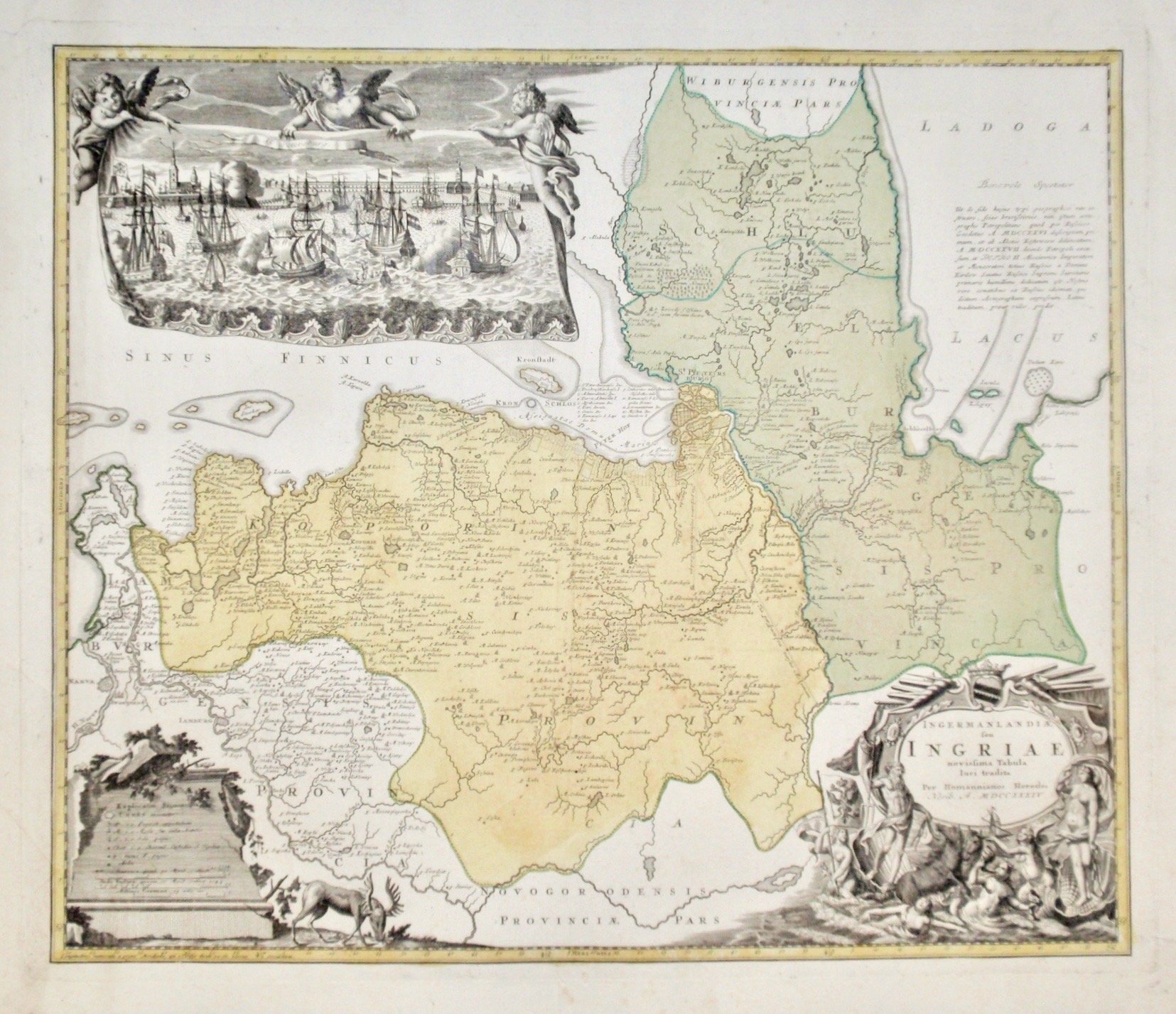 Incisione in rame, mm 470x555, dipinta d'epoca. Interessante carta geografica, molto detagliata con due bei cartigli in basso e la veduta, mm 150x250 in alto a sinistra della città S. Pietroburgo raffigurante il fiume Neva. La dicitura "Eredi Homann" distingue l'attività tipografica intrapresa dai figli e generi di J.B. Homann, nato a Norimberga nel 1663. Questi, dopo l'apprendistato presso D. Funk e G. Sandrart, nel 1702 iniziò una propria produzione cartografica, raggiungendo ben presto un notevole successo per l'eleganza e la modernità, ben amalgamando aspetto scientifico e decorativo. Nel 1707 pubblicò il primo atlante, arricchendolo rapidamente fino a superare il centinaio di carte con il 'Grosser Atlas" di 126 carte. Morì nel 1723.<BR>Bell'esemplare, ottimo stato di conservazione. <BR>