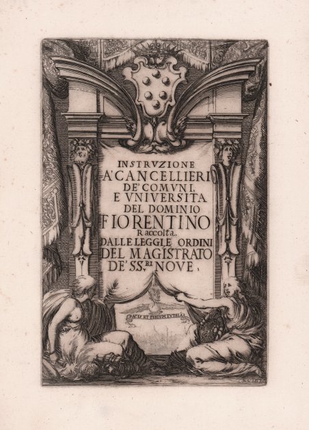 Acquaforte, 1635, firmata in lastra in basso a destra. Esemplare nel II stato finaleBella prova, impressa su carta vergata coeva, completa di margini, in perfetto stato di conservazione. Frontespizio dell’opera Instruzione a’ Cancellieri de’ Comuni, e Universita del Dominio Fiorentino Raccolta dalle Leggi, e Ordini del Magistrato de’ SSri Nove, pubblicata a Firenze da G.B. Landini nel 1635. Il titolo è inscritto entro cornice architettonica figurata, sormontata dallo stemma dei Medici, contornata da un elaborato drappeggio. Sotto il titolo, il motto Pacis et finium tutela. Stefano della Bella fu uno degli incisori più interessanti e originali nella Firenze del XVII secolo e può considerarsi l’unico geniale continuatore dell’opera di Jacques Callot. La sua educazione artistica ebbe inizio a Firenze nella bottega degli orafi Gasparo Mola e Orazio Vanni, e la precisione del segno, tipica dell’arte orafa resterà caratteristica del suo stile. Studiò poi presso Giovanni Battista Vanni e forse anche presso il Cantagallina e Cesare Dandini, ma ben presto si dedicò all'incisione. Il suo vero maestro può considerarsi Jacques Callot, l’incisore francese che soggiornò a lungo a Firenze lasciando una forte impronta nel panorama artistico della città. Gli anni più importanti della sua carriera sono quelli che trascorre a Parigi, dal 1639 al 1650, stipendiato da Lorenzo de' Medici: lavorò insieme ad Israel Silvestre, con gli editori Langlois, Ciartres e Pierre Mariette, per stampatori francesi e per commissioni di gran prestigio, come quelle del 1641 per il cardinale Richelieu che gli affidò le illustrazioni delle sue imprese guerresche. Intorno al 1647, durante un viaggio in Olanda, dove eseguì le acqueforti con le vedute del porto di Amsterdam, incontrò Rembrandt e da quella data notiamo una eco profonda dell’arte dell’olandese nella grafica del Della Bella. Etching, 1635, signed on plate at the lower right. Example of the second state, of two.A fine impressions, printed on contemporary laid paper, with margins, perfect conditions.Title page of the book “Instruzione a’ Cancellieri de’ Comuni, e Universita del Dominio Fiorentino Raccolta dalle Leggi, e Ordini del Magistrato de’ SSri Nove”, published in Florence by G.B. Landini, 1635. Stefano della Bella was one of the most interesting and original engravers in 17th-century Florence and can be considered the only brilliant continuator of Jacques Callot's work. His artistic education began in Florence in the workshop of the goldsmiths Gasparo Mola and Orazio Vanni, and the precision of sign, typical of the goldsmith's art, will remain characteristic of his style. He then studied under Giovanni Battista Vanni and perhaps also under Cantagallina and Cesare Dandini, but soon turned to engraving. His real master can be considered Jacques Callot, the French engraver who stayed in Florence for a long time and left a strong imprint on the city's artistic scene. The most important years of his career were the ones he spent in Paris, from 1639 to 1650, salaried by Lorenzo de' Medici: he worked together with Israel Silvestre, with the publishers Langlois, Ciartres and Pierre Mariette, for French printers and for commissions of great prestige, such as those of 1641 for Cardinal Richelieu, who entrusted him with illustrations of his warlike exploits. Around 1647, during a trip to Holland, where he executed etchings with views of the port of Amsterdam, he met Rembrandt, and from that date we note a profound echo of the Dutchman's art in Della Bella's graphic work. Cfr. De Vesme/Massar, 908 II/II.