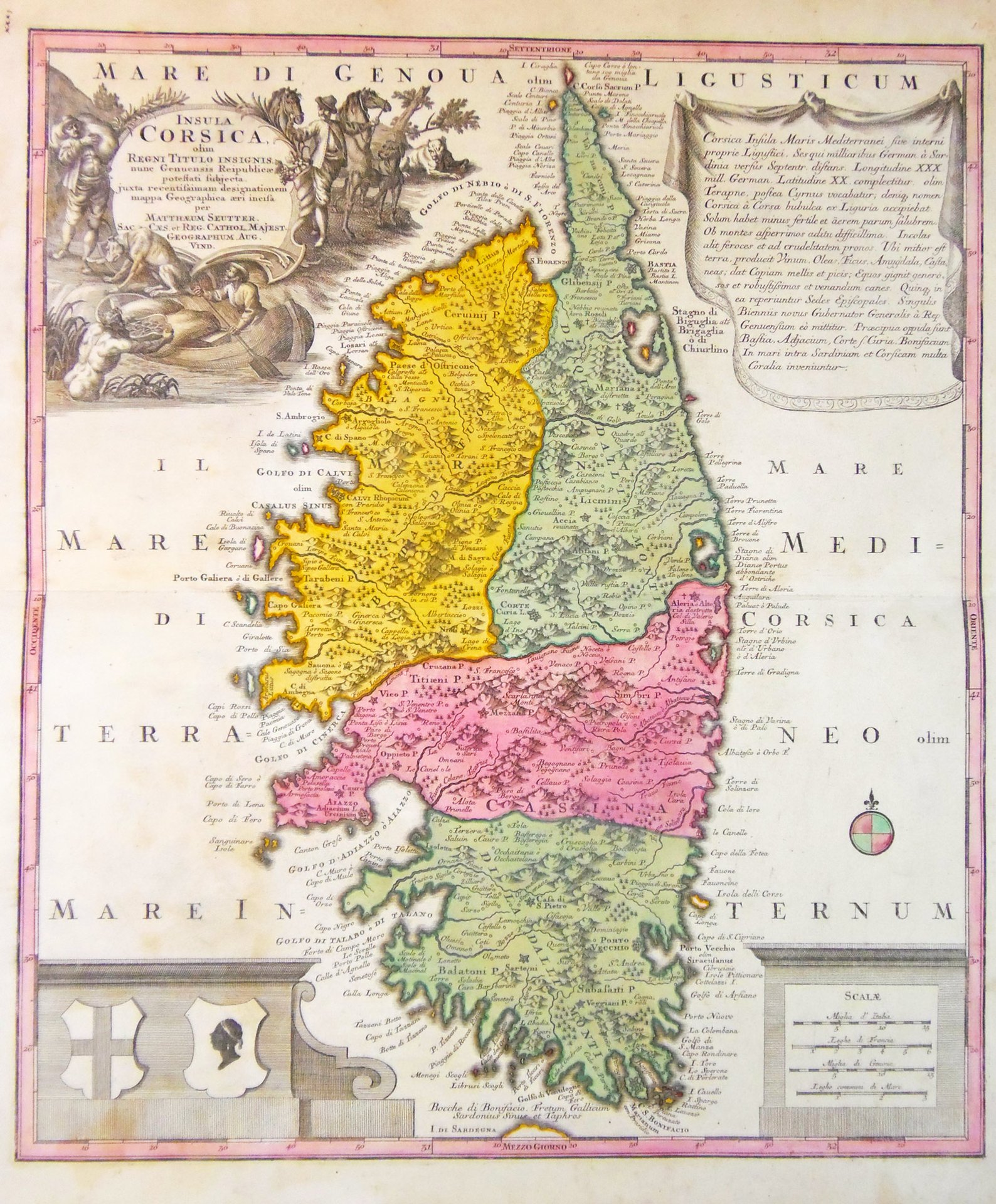 Incisione in rame, coloritura originale d'epoca con splendidi cartigli in bianco nero. mm 492x572. Seutter, dopo un apprendistato presso Homann a Norimberga, trasferitosi ad Augsburg verso il 1720, aprì la propria attività superando il maestro sotto il profilo della bellezza: le sue carte hanno sempre colori brillanti e cartigli elaborati. Esemplare in ottimo stato di conservazione. Copperplate, original colour, mm 492x572. Very good example in fine colour. Seutter, after having worked with Homann in Nuremberg, opened his own activity in Augsburg around 1720. His maps always have elaborate cartouches and are very decorative and printed on good paper.