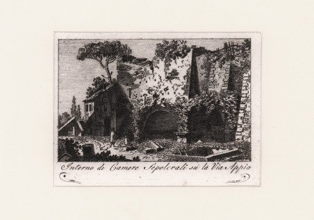 Veduta tratta dalla celebre ' Raccolta di num. 320 Vedute sì antiche, che moderne della città di Roma. …Incise a bulino in N. 80 rami, In Roma Nella Calcografia di Agapito Franzetti a Torsanguigna Col Permesso. ' L’opera si compone di un frontespizio calcografico e di 80 tavole numerate, ognuna composta da quattro vedute. Viene stampata senza data; molti repertori la datano intorno al 1790 circa, forse perché stampata su carta vergata. Una datazione intorno al 1800 ci sembra tuttavia più plausibile. ' Agapito Franzetti, calcografo attivo a Roma con bottega tra via del Corso e Torsanguigna, è noto per le sue piccole incisioni di veduta che servivano spesso come biglietti da visita. Tutte contengono, infatti, una linea in basso, dove si poteva apporre il proprio nome ad inchiostro. Come indicato nel titolo, le vedute raffigurano sia monumenti e antiche rovine che vedute “moderne”, con piazze, chiese e ville. Ciascuna tavola reca, in basso al centro, il nome dell’incisore. Gli artisti coinvolti sono sei: Jean-Jerome Baugean; Antonio Giuseppe Barbazza; Giovanni Battista Cipriani; Francesco Morelli; Antonio Poretta e Domenico Pronti. Molte delle vedute derivano dalla celebre opera di Giuseppe Vasi, ' Delle magnificenze di Roma antica e moderna. Pubblicata in 10 volumi dal 1747 al 1761, l’opera presenta 238 incisioni in rame, ciascuna incisione con testo narrativo che fornisce informazioni storiche e documentarie. ' Acquaforte, in buono stato di conservazione. ' Bibliografia: A. Bertarelli, H. Prior, ' Il biglietto da visita italiano. Contributo alla storia del costume e dell'incisione nel secolo XVII, Bergamo 1911, p. 162. View of the city printed in Rome by the publisher Agapito Franzetti. ' Taken from ' Raccolta di num. 320 Vedute sì antiche, che moderne della città di Roma. …Incise a bulino in N. 80 rami, In Roma Nella Calcografia di Agapito Franzetti a Torsanguigna Col Permesso. ' The work consists of an intaglio frontispiece and 80 numbered plates, each consisting of four views. It is printed without date; many repertories date it around 1790, perhaps because it was printed on laid paper. A date around 1800 seems more plausible. Franzetti, a chalcographer working in Rome with a workshop between Via del Corso and Torsanguigna, is known for his small engravings of views that were often used as business cards. They all contain a line at the bottom where one's name could be written in ink. The small views were often printed four to a sheet. As indicated in the title, the views depict both monuments and ancient ruins and "modern" views, with squares, churches and villas. Each table bears, at the bottom center, the name of the engraver. ' There are six artists involved: Jean-Jerome Baugean; Antonio Giuseppe Barbazza; Giovanni Battista Cipriani; Francesco Morelli; Antonio Poretta and Domenico Pronti. ' The views are made after Giuseppe Vasi’s monumental work ' Delle magnificenze di Roma antica e moderna. ' Published in 10 volumes from 1747 to 1761, the work features 238 copper engravings, each engraving with a narrative text that provides historical and documentary information. Bibliografia: A. Bertarelli, H. Prior, ' Il biglietto da visita italiano. Contributo alla storia del costume e dell'incisione nel secolo XVII, Bergamo 1911, p. 162. Cfr.