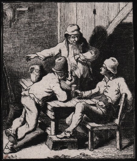 Tre uomini in conversazione intorno ad un tavolo di un’osteria. Acquaforte, circa 1640, firmata in basso a sinistra V. Ho sc. Bellissima prova, impressa su carta vergata coeva, rifilata alla linea marginale, in perfetto stato di conservazione. Isaac van Ostade (battezzato il 2 giugno 1621 - sepolto il 16 ottobre 1649) è stato un pittore olandese di genere e paesaggio. Van Ostade nacque ad Haarlem. Iniziò i suoi studi sotto suo fratello, Adriaen, con il quale rimase fino al 1641, quando iniziò il suo proprio studio. In un primo periodo sentì l'influenza di Rembrandt, ma ben presto trovò uno stile più adatto alle sue inclinazioni. Produsse quadri nel 1641-1642 sulle linee di suo fratello, ricevendo, tuttavia, compensi bassi per questo tipo di pittura, in cui poteva solo rimanere subordinato al più celebre Adriaen. Gradualmente abbandonò i soggetti dei cottage di Adriaen per i paesaggi alla moda di Esaias van de Velde e Salomon van Ruysdael. Il progresso di Isaac nel suo nuovo percorso fu molto facilitato dalla sua precedente esperienza come pittore di figure; e, anche se ora sceglieva i suoi soggetti dalle strade del villaggio o dai canali ghiacciati, dava nuova vita alle scene raffigurando gruppi animati di persone con uno studio raffinato e ricercato dei contrasti pittoreschi. Non visse abbastanza a lungo per portare la sua arte alla massima perfezione. Morì il 16 ottobre 1649 a Haarlem, dopo aver dipinto circa 400 quadri. ' Bibliografia L'Œuvre d'Ostade, cu description des eaux-fortes de ce maître, Auguste d'Orange (1860); Catalogue ' Isaac van Ostade (baptized June 2, 1621 - buried October 16, 1649) was a Dutch genre and landscape painter. ' Van Ostade was born in Haarlem. He began his studies under his brother, Adriaen, with whom he remained until 1641, when he started his own studio. At first he felt the influence of Rembrandt, but soon found a style more suited to his inclinations. He produced paintings in 1641-1642 on the lines of his brother, receiving, however, low fees for this type of painting, in which he could only remain subordinate to the more famous Adriaen. Gradually he abandoned Adriaen's cottage subjects for the fashionable landscapes of Esaias van de Velde and Salomon van Ruysdael. Isaac's progress in his new course was greatly facilitated by his previous experience as a figure painter; and, although he now chose his subjects from village streets or frozen canals, he gave new life to the scenes by depicting animated groups of people with a refined and searching study of picturesque contrasts. He did not live long enough to bring his art to its greatest perfection. He died on October 16, 1649 in Haarlem, after having painted about 400 pictures. Cfr.