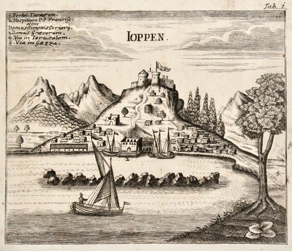 Incisione in rame, mm 140x170. Non comune veduta prospettica tratta da "Peregrinus in Jerusalem". Buone condizioni anche se presenta un alone e piccole macchie nel margine destro. <BR>