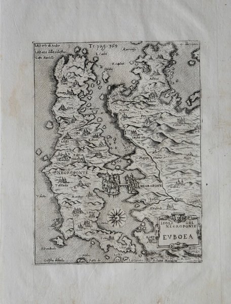 Questa mappa di Eubea è una rappresentazione originale basata su fonti primarie, ed è orientata con il Nord in basso. L’immagine topografica è accurata e molto simile alla realtà; lo conferma la posizione della capitale Chalkis situata esattamente nello stretto vicino la terra ferma. Come giustamente fa notare il Meurer il lavoro cartografico più noto del Bonifacio fu la serie delle mappe raffiguranti le isole dell’arcipelago greco, sia del Mar Jonio che dell’Egeo. Esse non sono datate e quindi è difficile assegnare una sequenza cronologica alla serie, databile al periodo 1567/68. Come tutte le carte della cosiddetta scuola lafreriana venivano stampate a se e quindi assemblate in atlanti compositi. Questo esemplare è tratto dall'opera ' Universus terrarum orbis scriptorum calamo delineatus . qui de Europae, Asiae, Africae, & Americae regnis, provinciis, populis, civitatibus. pubblicata a Padova nel 1713, presso Matteo Cadorin, da Raffaello Savonarola, sotto lo pseudonimo di Lasor a Varea (o Varela). L'opera era una sorta di enciclopedia che conteneva notizie sulle varie località del mondo disposte in ordine alfabetico, arricchita da mappe e vedute di tutto il mondo che appartengono a celebri raccolte cartografiche del passato – Bertelli, Valegio, Camocio, Bonifacio, Nelli, Magini e altri – del quale probabilmente l’editore Cadorin era in possesso delle matrici originali. Incisione su rame, ampi margini, in ottimo stato di conservazione. The probably best known cartographic works of the engraver Natale Bonifacio is a serie of maps showing Greek Islands in the Ionian en Aegean Seas. They are all undated and their chronological sequence is difficult to ascertain. Like the larger maps of The IATO these smaller ones were first issued for a loose sheet circulation, and then assembled in booklet form for interested customer. As noted by Meurer, due of they small format, they were infrequently added to composite atlases. This example is taken from the work ' Universus terrarum orbis scriptorum calamo delineatus . qui de Europae, Asiae, Africae, & Americae regnis, provinciis, populis, civitatibus. ' published in Padua in 1713, at Matteo Cadorin, by Raffaello Savonarola, under the pseudonym of Lasor a Varea (or Varela). The work was a kind of encyclopedia containing news about the various localities of the world arranged in alphabetical order, enriched with maps and views of the whole world belonging to famous cartographic collections of the past-Bertelli, Valegio, Camocio, Bonifacio, Nelli, Magini, and others-of which the publisher Cadorin probably possessed the original plates. Copper engraving, in excellent condition. Cfr. Meurer, The Strabo Illustratus Atlas, p. 97, 83; Zacharakis, A catalogue of printed maps of Greece, 347/216.