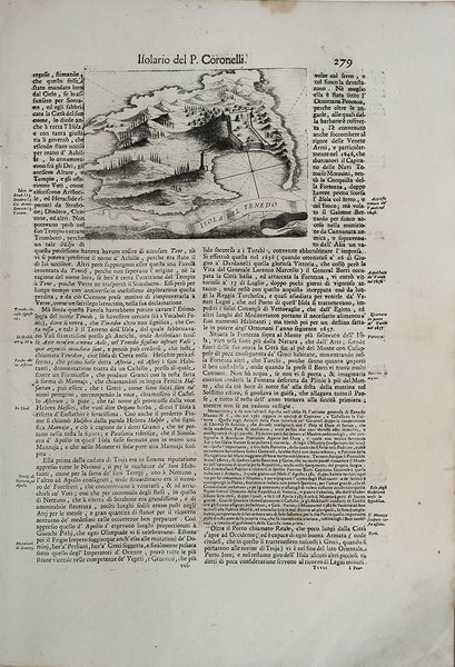 Opera tratta dall’Isolario dell’Atlante Veneto del P. Coronelli, In Venetia MDCXCVI. Coronelli visse un periodo di straordinaria fecondità editoriale a partire dal 1689, quando ebbe la cattedra di geografia presso l'Università alle Procuratie, con la pubblicazione, nel 1690, del primo volume dell'Atlante Veneto. In effetti sotto il nome di ' Atlante Veneto ' va tutta la raccolta di tredici opere composte nell'arco del decennio successivo, dall'Isolario ' allo ' Specchio del mare. L'Isolario ' mira, con una barocca e minuziosa ricerca del dettaglio, alla celebrazione dei possedimenti della Serenissima. Monumentale raccolta di carte e vedute di isole, rappresenta l'ultimo degli “isolari” concepiti, che, tra la fine del XVII e l'inizio del XVIII secolo, vennero progressivamente soppiantati dagli atlanti di moderna concezione, opere a stampa caratterizzate da crescente precisione scientifica e da sempre minore pregio artistico. Sulla scia delle nuove conquiste coloniali le rappresentazioni cartografiche vennero ad assumere un carattere sempre più tecnico, fino ad allora piuttosto arbitrario. Incisione in rame posta nella parte superiore del foglio che contiene il testo descrittivo, in ottimo stato di conservazione. The map is taken from ' Isolario dell’Atlante Veneto del P. Coronelli, In Venetia MDCXCVI. Coronelli lived a period of extraordinary editorial fecundity starting from 1689, when he had the chair of geography at the University at the Procuratie, with the publication, in 1690, of the first volume of the ' Atlante Veneto. Under the name of ' Atlante Veneto ' goes the entire collection of thirteen works composed over the next decade, from the ' Isolario ' to the ' Specchio del mare. The ' Isolario ' aims, with a baroque and meticulous search for detail, to celebrate the possessions of the Serenissima. Monumental collection of maps and views of islands, represents the last of the "isolarios" conceived, which, between the end of the seventeenth and the beginning of the eighteenth century, were gradually supplanted by modern atlases, printed works characterized by increasing scientific precision and less and less artistic value. In the wake of the new colonial conquests, cartographic representations came to assume an increasingly technical character, until then rather arbitrary. Copperplate in very good conditions. Set in a page of text. Cfr.