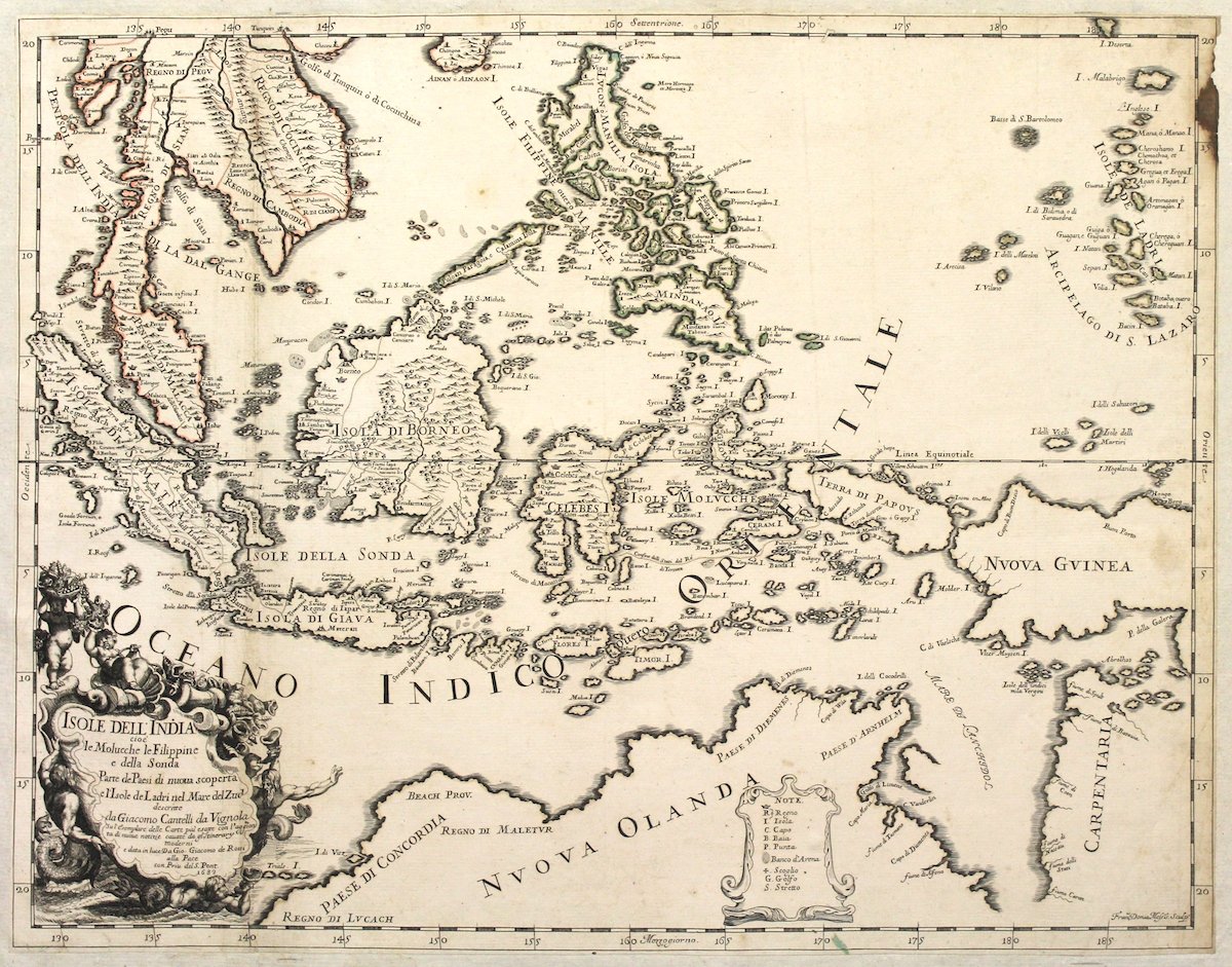 Incisione in rame, mm 450x580. Piacevole e non comune carta tratta dall'opera Il Mercurio Geografico, degli editori romani De Rossi e per la cura di Giacomo Cantelli da Vignola, geografo del Duca d'Este. L'atlante risulta edito dal 1690 circa con diverse edizioni successive. <BR>La carta si estende da Sumatra alla Nuova Guinea e Australia settentrionale. La carta raffigura inoltre l'isola di Singapore e riporta interessanti particolari relativi alle Isole delle Spezie, al Borneo e alle Filippine. Nell'angolo in basso a sinistra è riportato il titolo all'interno dell'ampio cartiglio, decorato da sirene, tritoni e putti che giocano. Giacomo Cantelli nacque a Vignola, come ribadisce con la sua firma, e divenne il primo cartografo ufficiale della Corte di Modena, nel 1685, quando il Duca Francesco II lo nominò cartografo e custode della biblioteca. Buon esemplare, smarginata, tracce di colore in controparte a destra in alto. Quirino, Philippine Cartography, p. 112 <BR>Copper engraving, mm 450x580. Scarce map extending from Sumatra to New Guinea and northern Australia. Singapore Island is identified and interesting details are provided on Spice Islands, Borneo and the Philippines. In lower left corner a large title cartouche, decorated with mermaids, mermen and playful putti. Giacomo Cantelli was born in Vignola, as he remarked with his signature, and was the first official cartographer of the Court of Modena, in 1685, when the Duke Francis II appointed him geographer. Good example with trimmed margins and a brown stain at right handside. Quirino, Philippine Cartography, p. 112