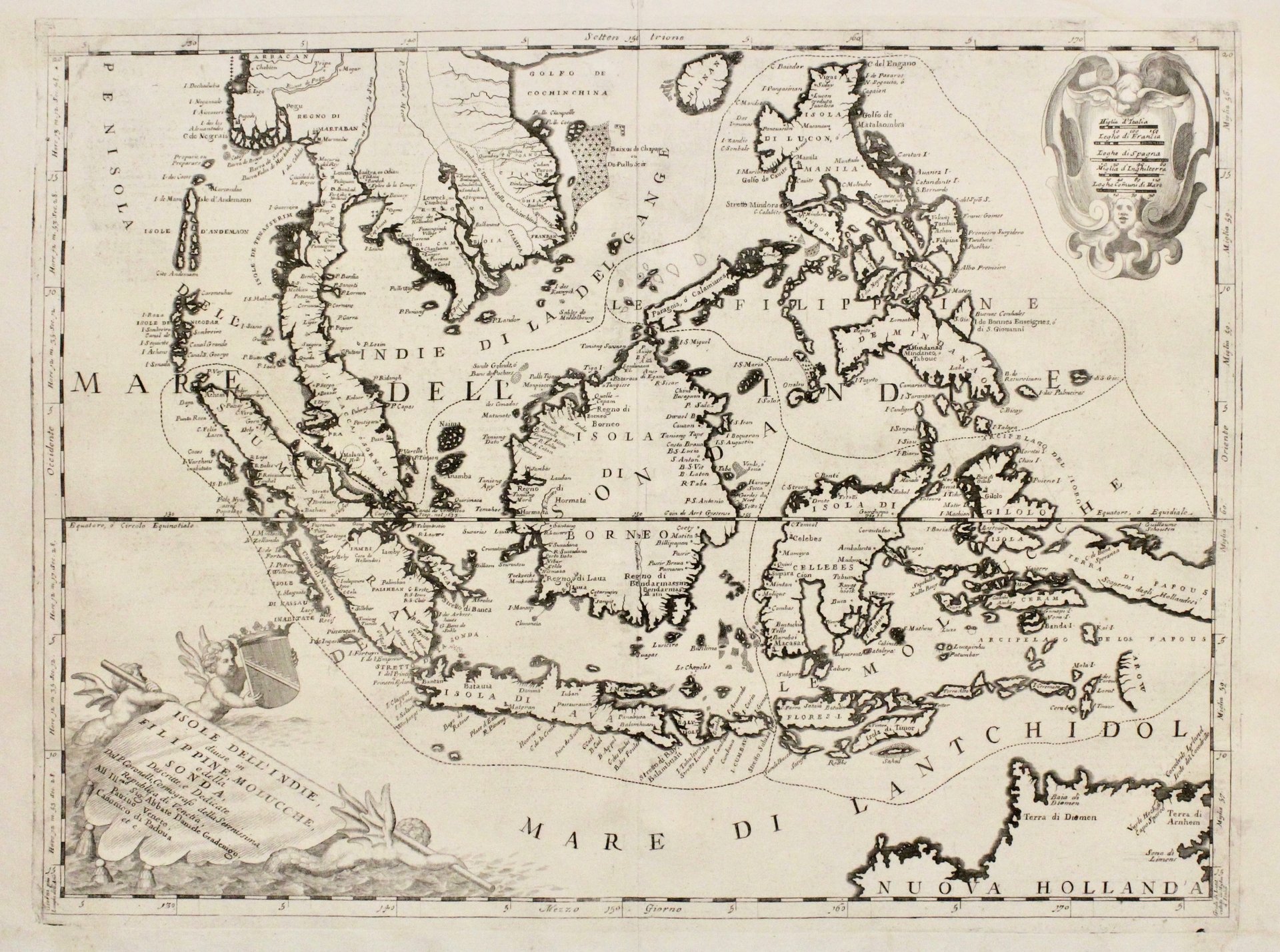 Copper engraving, mm 460x615; decorative map of South-East Asia from Burma to Australia, enriched by cartouches with title and scales, helsd by mermaids. From "Corso geografico", one among the most important works by Coronelli, who published, between end of the XVII and beginning of XVIII century, many famous books, like "Libro dei globi", and "Atlante Veneto". Perfect example, wide margined map