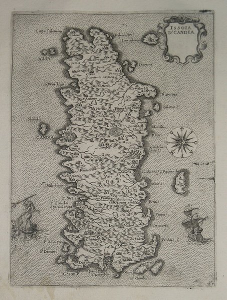 Deriva dalla carta di Matteo Pagano del 1538. Secondo stato di quattro con la firma del Bonifacio in basso a destra. A destra in alto, in un cartiglio, ISSOIA D’ CANDIA. Orientazione con rosa dei venti, il nord a sinistra. Carta priva di scala grafica e graduazione ai margini. Acquaforte e bulino, mm 210x155.La mappa è basata sul modello introdotto a Venezia dalla mappa di Zorzi/Pagano (1538); differisce l’orientazione, con l’est posto in alto. La carta appartiene ad un corpus di mappe raffiguranti le isole dell’arcipelago greco, sia del Mar Jonio che dell’Egeo. Meurer afferma che le mappe costituiscano il lavoro cartografico più noto del Bonifacio; non datate, è quindi difficile assegnare una sequenza cronologica alla serie, vengono fatte risalire al periodo 1567-70. Le carte si trovano occasionalmente nelle raccolte cinquecentesche, spesso in gruppo numeroso. Alcune Vengono incluse anche nella raccolta di carte di piccolo formato della famiglia Bertelli, il Civitatum aliquot insignorum et locorum magis monitorum exacta delineation cum additione aliquot Insularum principalium. Disegni di alcune più illustri città et fortezze del mondo con aggionta di alcune Isole principali edito da Ferrando Bertelli nel 1568. Altre compaiono solo nella successiva ristampa curata da Donato Bertelli nel 1574, quindi si presume siano state realizzate dopo la prima edizione del Civitatum. Le carte vengono spesso erroneamente attribuite dalla letteratura proprio a Donato Bertelli, che ne curò solamente la stampa. La lastra conosce una successiva ristampa nel 1713; è infatti inserita nell’opera Universus terrarum orbis scriptorum calamo delineatus di Alphonsus Lasor a Varea (prseudonimo di Raffaello Savonarola), edita a Padova. Sulla mappa viene inciso un numero relativo alla pagina di citazione nel libro.Stati & edizioni: 1°: come descritto, prima del monogramma.2°: nell’angolo in basso a destra aggiunta la firma NBF.3°: con titolo cambiato in L’ISOLA DI CANDIA CRETA.4°: aggiunto il riferimento pag. 304 T1 in alto a sinistra. After the Matteo Pagano map of 1538 published in Venice. Second state of four with the Bonifacio's signature. The probably best known cartographic works of the engraver Natale Bonifacio is a serie of maps showing Greek Islands in the Ionian en Aegean Seas. They are all undated and their chronological sequence is difficult to ascertain. Like the larger maps of The IATO these smaller ones were first issued for a loose sheet circulation, and then assembled in booklet form for interested customer. Some of the maps, separately issued, appear in copies of the first edition of Ferrando Bertelli’s “Civitatum aliquot insignorum et locorum magis monitorum exacta delineation cum additione aliquot Insularum principalium. Disegni di alcune più illustri città et fortezze del mondo con aggionta di alcune Isole principali”, of 1568. Others are known only from the second edition of the Bertelli book, published by Donato in 1574 and from the undated “Isole Famose…” by Giovanni Francesco Camocio. As noted by Meurer, due of they small format, they were infrequently added to composite atlases. Cfr. Meurer (2002): n. 91; Gallo (1950): p. 99, n. 35; Zacharakis (1992): nn. 208, 1226; Zacharakis (2009): nn. 337-338, 1853.