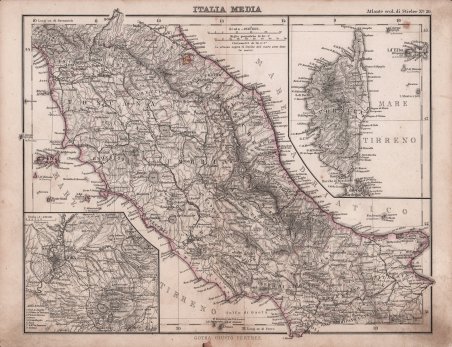 Carta tratta dall’Atlante scolastico per la geografia politica e fisica: scelta di 25 tavole incise in rame e miniate, eseguita sulla quarantesima edizione originale dell'atlante scolastico di Ad. Stieler ed Erm. Berghaus. . - (Torino, Firenze e Roma : libreria di Ermanno Loescher, 1880).Gotha : Giusto Perthes, 1880. Edizione italiana dell’atlante scolastico di Adolf Stieler (Gotha, 26 febbraio 1775 – Gotha, 13 marzo 1836) è stato un cartografo tedesco. Stieler è noto per aver dato un significativo contributo allo sviluppo della cartografia in Germania, che raggiunse il suo apice con l'Atlante Stieler da lui curato. Le carte di Stieler vennero apprezzate anche da altri editori e fu così che egli iniziò la collaborazione con Justus Perthes, che sarebbe durata per tutta la sua vita. Nel 1815 Stieler propose a Perthes di pubblicare un atlante che si distinguesse per praticità del formato, maggiore precisione possibile, chiarezza e completezza, nonché adeguata scelta e regolarità della proiezione e della scala, qualità della carta e della stampa, cura della colorazione e prezzo contenuto. Il così denominato Stielers Handatlas ("Atlante Stieler"), che era formato da 50 tavole, fu dato alle stampe in fascicoli tra il 1817 e il 1823 e riscosse col tempo un notevole successo, anche oltre la morte dell'autore, avvenuta nel 1836; di fatto l'Atlante Stieler rappresentò il meglio della produzione geografica tedesca tra la seconda metà del XIX secolo e l'inizio del Novecento. Carta tratta dall’Atlante scolastico per la geografia politica e fisica: scelta di 25 tavole incise in rame e miniate, eseguita sulla quarantesima edizione originale dell'atlante scolastico di Ad. Stieler ed Erm. Berghaus. . - (Torino, Firenze e Roma : libreria di Ermanno Loescher, 1880).Gotha : Giusto Perthes, 1880. Edizione italiana dell’atlante scolastico di Adolf Stieler (Gotha, 26 febbraio 1775 – Gotha, 13 marzo 1836) è stato un cartografo tedesco. Stieler è noto per aver dato un significativo contributo allo sviluppo della cartografia in Germania, che raggiunse il suo apice con l'Atlante Stieler da lui curato. Le carte di Stieler vennero apprezzate anche da altri editori e fu così che egli iniziò la collaborazione con Justus Perthes, che sarebbe durata per tutta la sua vita. Nel 1815 Stieler propose a Perthes di pubblicare un atlante che si distinguesse per praticità del formato, maggiore precisione possibile, chiarezza e completezza, nonché adeguata scelta e regolarità della proiezione e della scala, qualità della carta e della stampa, cura della colorazione e prezzo contenuto. Il così denominato Stielers Handatlas ("Atlante Stieler"), che era formato da 50 tavole, fu dato alle stampe in fascicoli tra il 1817 e il 1823 e riscosse col tempo un notevole successo, anche oltre la morte dell'autore, avvenuta nel 1836; di fatto l'Atlante Stieler rappresentò il meglio della produzione geografica tedesca tra la seconda metà del XIX secolo e l'inizio del Novecento. Cfr.