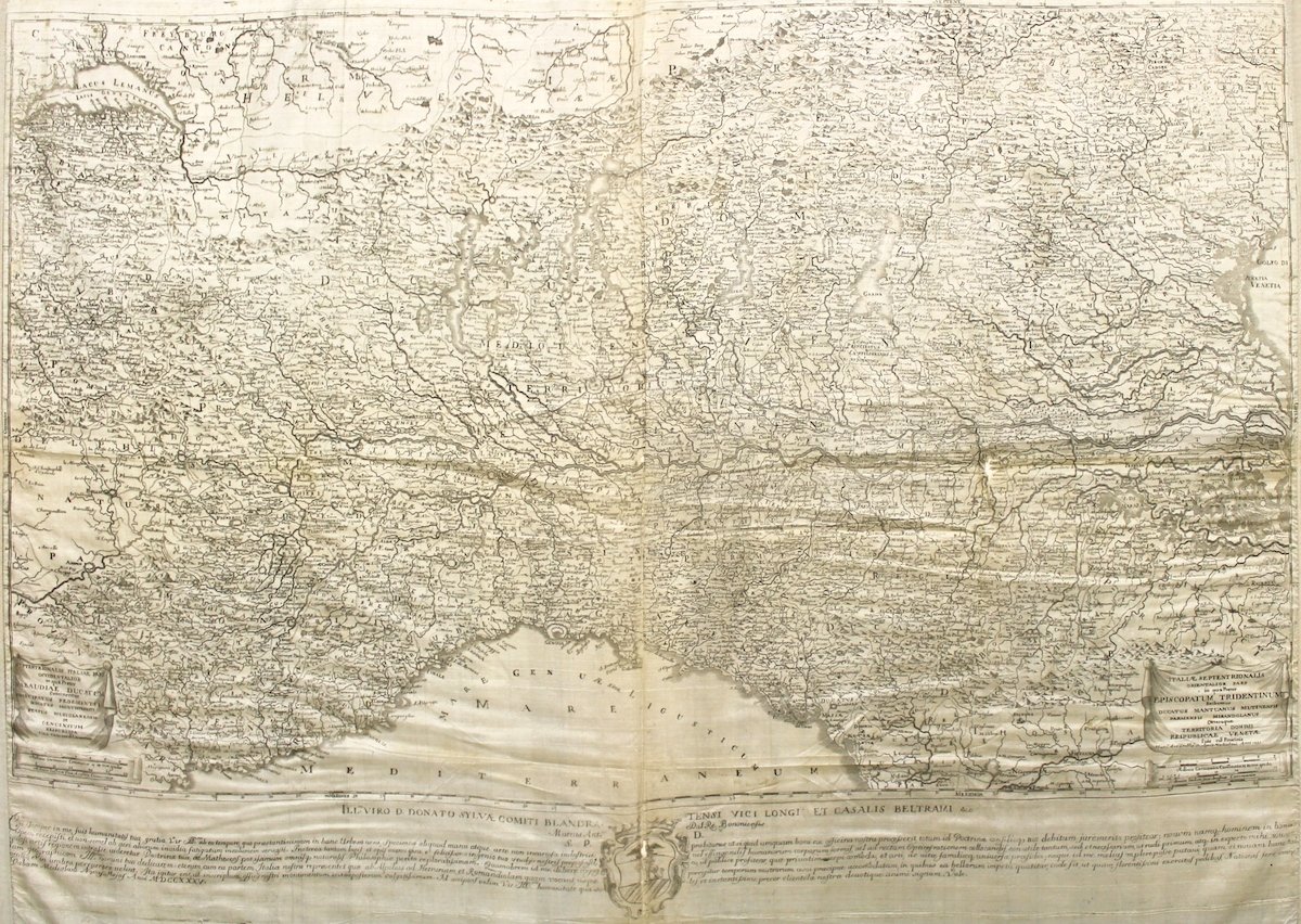 Incisione in rame, mm 870x960, stampata su seta. <BR>La grande carta geografica illustra quasi tutta l'Italia settentrionale: come indicato nel titolo, le parti occidentale e orientale del nord Italia, nelle quali sono rispettivamente compresi il ducato sabaudo, lo stato di Milano, la repubblica genovese; l'episcopato di Trento, i ducati di Mantova, Modena e Parma, la Repubblica di Venezia. Le zone montuose sono rese in modo pittorico e le città principali sono evidenziate dall'uso del colore rosso. Notevole la messe di informazioni topografiche.<BR>La carta, di dimensioni considerevoli, risulta divisa in trentadue fogli rettangolari applicati su un supporto in tela azzurra e si presenta ripiegata in un astuccio nero in cartoncino sui cui fianchi è riportato il titolo "MANTOVA" in lettere capitali dorate.<BR>La carta in esame riporta, oltre alla dedica al personaggio illustre di cui sopra (cfr. campo Iscrizioni), lo stemma comitale dello stesso, posto al centro di una lunga iscrizione celebrativa in latino che termina con l'indicazione "Dabam Mediolani Nonas Majas Anni MDCCXXXV".<BR>Autore dell'incisione è Marco Antonio Dal Re, incisore (e in seguito anche editore) di origine bolognese trasferitosi a Milano nel 1723, dopo un soggiorno a Cremona nel 1719 dove già svolgeva l'attività di incisore. La sua opera più nota è "Ville di delizia", una raccolta di incisioni dedidicate alle principali ville nobiliari del milanese originariamente concepita in sei tomi: nel 1726 pubblicò il primo volume con otto ville illustrate e, nel 1743, il secondo volume in due tomi con nove ville più tre ripetute dall'edizione del 1726. Rimase sempre a Milano, ove morì il 23 aprile del 1766. <BR>Nel Settecento la produzione di carte geografiche stampate su seta era d'uso, sebbene assai raro, ed assai rari sono gli esemplari sopravissuti. Le carte venivano preparate appositamente per ufficiali degli eserciti in modo da poter essere facilmente consultate sul campo. Alcuni editori si specializzarono nella loro produzione fra cui il lorenese Briffaut attivo a Vienna ed evidentemente il milanese Dal Re<BR>Qualche minimo difetto ed una scucitura ad una piega ma praticamente perfetta nel suo stato originale di conservazione<BR>