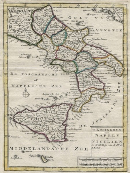 Incisione in rame, dipinta d'epoca, mm 240x185. Non comune carta del Regno delle due Sicilie. Ottimo stato di conservazione. <BR>