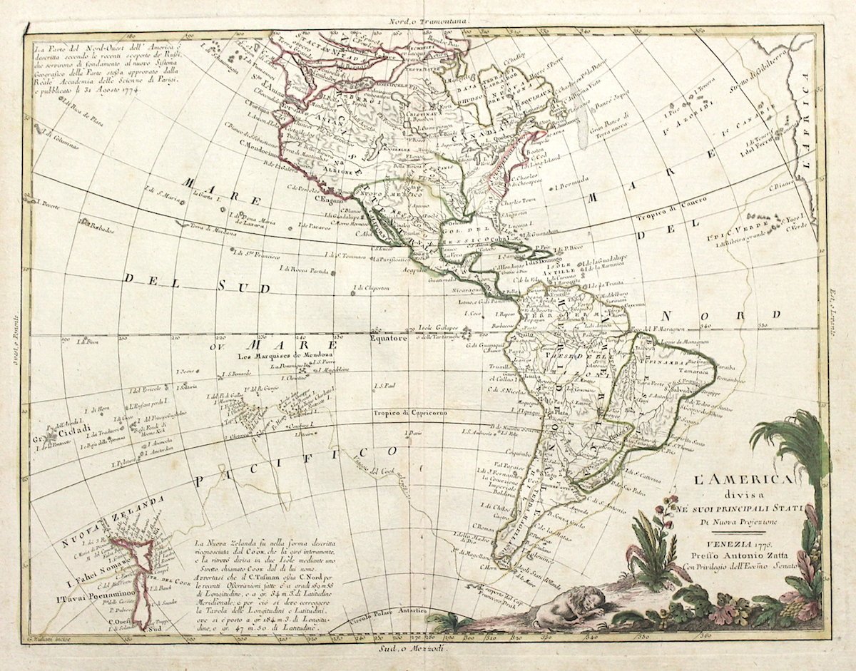 Incisione in rame di mm 315x420, colorata d'epoca ai confini. Tratta da "Atlante novissimo". Ottimo esemplare in piano senza piega centrale con aloni all'esterno del marg. dx. Antonio Zatta (1775-1797) fu uno dei più importanti editori di carte geografiche del trardo XVIII secolo italiano. La sua opera costituisce un importante punto di passaggio tra la cartografia antica e moderna, più attenta all'accuratezza dei dettagli geografici che all'abbellimento estetico ricco di motivi mitologici o d'invenzione, come era quello dell'epoca precedente. La sua opera più importante è Atlante novissimo pubblicato tra il 1775 e il 1789.