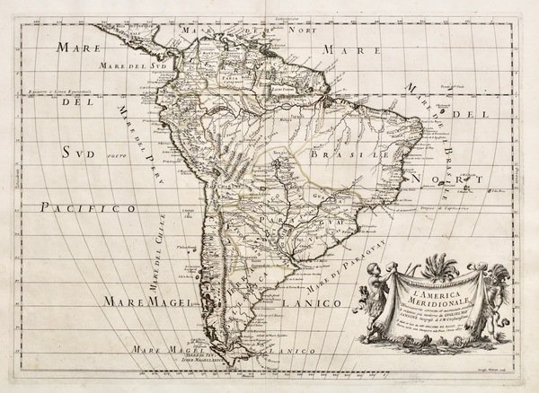 Incisione in rame, colorata d’epoca ai confini, mm 395x550. Bella carta eseguita da De Rossi, su modello di quella di Sanson, nello stile imperante all’epoca, dettato dal gusto della cartografia francese, tratta da "Mercurio geografico". Ottimo esemplare lievemente ondulato.