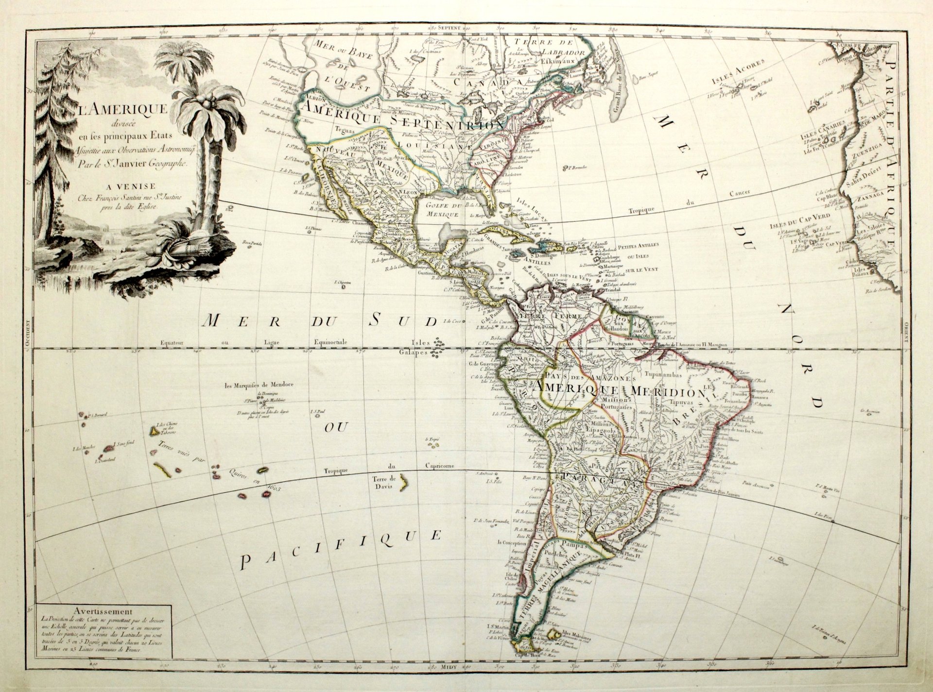 Incisione in rame, mm 515x684, dipinta a mano d’epoca ai confini. Carta del continente americano basata su quella di Janvier, come espresso nel cartiglio in alto a sinistra. Tratta da “Atlas Universel”, sontuoso atlante composto da mappe che rielaborano la più aggiornata cartografia francese in una veste veneta. Le carte sono prese dai migliori geografi del suo tempo, D’Anville, Bellin, Bonne, Borgogno, Boscovich, Clarici, Delisle, Jaillot, Janvier, Robert de Vaugondy. L’atlante di Santini non ebbe una grande fortuna editoriale e uscì in poche copie: venne quindi ristampato dai Remondini, che avevano acquistato dal Santini nel 1781 le lastre in rame. Alle carte di Paolo Santini, datate fra il 1774 e il 1780, i Remondini aggiunsero diverse altre carte, datate fra il 1782 e il 1784: fra queste, nel secondo volume, la grande carte ripiegata dell’Italia, la Repubblica di Genova, la Palestina, le grandi carte dell’Africa
