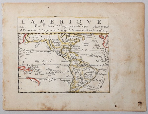 Acquaforte, 1656 circa, con coloritura coeva dei contorni, in buone condizioni.Esemplare del secondo stato di due, con l’imprint di Jacques Lagniet e la data del 1661.La mappa proviene dal rarissimo foglio intitolato “L’Amerique par P. Du Val Geographe du Roy”, dal quale è stato ritagliato all’epoca - come anche certificato dalle antiche iscrizioni a inchiostro su alcune delle mappe - venendo applicato su un supporto di carta contemporanea, a formare un piccolo atlante in-sedicesimo oblungo.Secondo Philip Burden, lo scopo di questa rara curiosità cartografica di Pierre Duval non è noto. Fa parte di un insieme di quattro tavole raffiguranti i continenti. Può essere datato, per motivi cartografici, all’incirca nel 1656. L’unico esemplare del primo stato del foglio dell’America noto all’autore proviene dalla John Evelyn Library. Il secondo stato del foglio reca l’imprint aggiuntivo di Jacques Lagniet e la data del 1661 (cfr. Burden, The Mapping of North America, pagg. 417-418, n. 322). Burden elenca solo 2 esemplari del secondo stato, in una collezione americana privata (The Glen McLaughlin Map Collection of California as Island, oggi conservata presso la Stanford University) e presso la Bibliotheque National de France (che possiede l’insieme dei quattro continenti).La raccolta di mappe americane di Pierre Duval è sia rara che insolita. Il foglio contiene 18 singole mappe di varie parti del Nord e del Sud America. La mappa generale in alto a sinistra è disegnata dalla mappa di formato in-folio dello stesso Duval (1655), che mostra l’isola della California, senza Grandi Laghi, e una grande massa denominata “Terre de Iesso” che si estende tra l’Asia e il Nord America.Ce ne sono otto dedicati al Nord America; quattro dei quali sono basati sulle mappe di Sanson del 1656 - Le Canada, La Nle. Espagne, Le N. Mexique e La Floride. Il confronto di Burden con le mappe di Sanson lo porta a credere che la mappa di Duval potrebbe aver preceduto la carta di Guadalajara di Sanson o forse essere stata pubblicata contemporaneamente, rendendo questa mappa del New Mexico effettivamente la prima dedicata all’isola della California. Le quattro piccole mappe lungo il centro della fila inferiore: La Virginie, La Nle. Holande, La Nle. Suede e Le Nouveau Danemarq sono estremamente interessanti perché ci sono poche mappe contemporanee dedicate a queste regioni. La mappa di New Holland mostra la parte inferiore del R. del Nort (fiume Hudson). La mappa della Nuova Svezia è la prima mappa a concentrarsi sul fiume Delaware. La mappa della Nuova Danimarca raffigura la regione artica rivendicata dalla Danimarca a nord-ovest della baia di Hudson, qui etichettata Mer Christiane.Le altre mappe sul foglio includono due dedicate alle Indie occidentali e sette mappe regionali del Sud America: La Guiane, La Castille d'Or, Le Perou, Le Bresil, Le Chili, Le Paraguay e La Magellanique. Etching, circa 1656, with contemporary outline colour, good condition.Example of the second state of two, with the imprint of Jacques Lagniet and the date 1661.The map comes from the very rare sheet entitled “L’Amerique par P. Du Val Geographe du Roy”, from which it was cut at the time and laid down on contemporary laid paper support, to form a small atlas, as certified by the ancient ink inscriptions on some of the maps.According with Philip Burden “The purpose of this rare curiosity by Pierre Duval is not known. It forms part of a set of the four known continents. It can be dated to apporximately 1656 […] The only example of the first state known to the author come from the John Evelyn Library in the early 1980s. The second state bears the additional imprint of Jacques Lagniet and the date 1661”. (cf. Burden, The Mapping of North America, pp. 417-418, n. 322). Burden list only 2 example of the second state, in a private American collection (The Glen McLaughlin Map Collection of California as an Island, at Stanford University) and at the Bibliotheque National de France (that own all the set of four continents).Pierre Duval's compilation of American maps is both rare and unusual. The sheet contains 18 individual maps of various parts of North and South America. The general map at top left is drawn from Duval's own folio map of 1655, which features the island of California, no Great Lakes, and a large Terre de Iesso stretching between Asia and North America.There are eight devoted to North America; four of which are based on Sanson's maps of 1656 - Le Canada, La Nle. Espagne, Le N. Mexique, and La Floride. Burden's comparison with Sanson's maps leads him to believe that Duval's map may have preceded Sanson's Audience de Guadalajara or possibly were published concurrently, making this map of New Mexico actually the first devoted to the island of California. Interestingly, on the small map the island is presented on the Foxe model, while on the general map it is shown on the Briggs format. The four small maps along the center of the bottom row - La Virginie, La Nle. Holande, La Nle. Suede, and Le Nouveau Danemarq are extremely interesting because there are few contemporary maps devoted to these regions. The map of New Holland features the lower part of the R. del Nort (Hudson River). The map of New Sweden is the first map to focus on the Delaware River. The map of New Denmark depicts the Arctic region claimed by Denmark to the northwest of Hudson Bay, here labeled Mer Christiane.The other maps on the sheet include two devoted to the West Indies, and seven regional maps of South America - La Guiane, La Castille d'Or, Le Perou, Le Bresil, Le Chili, Le Paraguay, and La Magellanique. Cfr. Burden, The Mapping of America, n. 322, II/II; Pastoureau (1984) p. 136; cf. Betz, The Mapping of Africa, pp. 294, 295, n. 85; cf. J. Hubbard, Japoniae Insulae. The Mapping of Japan, pp. 199-201, n. 28.