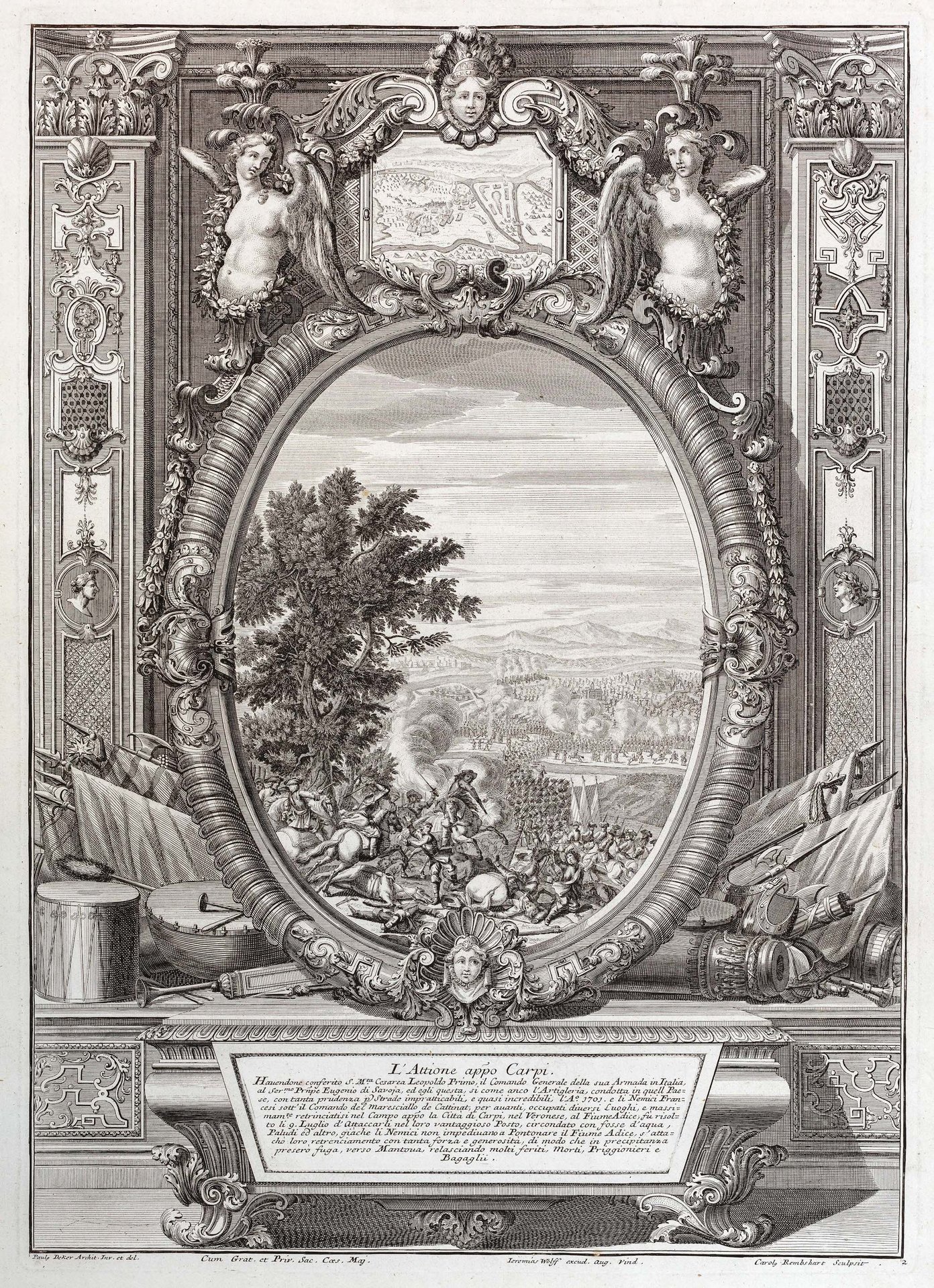 Incisione in rame eseguita da C. Rembshart su soggetto di Decker, mm 496x353. Scena della battaglia con le truppe che passano l'Adige presso il paese di Carpi veronese. Il tutto racchiuso da una ricchissima cornice ornamentale figurata. Rara stampa tratta dalla ancor più rara edizione italiana di "Representatio belli ob successionem in regno ispanico auspicis trium …Leopoldi I, Josephi I et Caroli VI intra XIV annos…", celebre opera raffigurante le battaglie e gli episodi principali della guerra di Successione spagnola. Bell'esemplare. <BR>