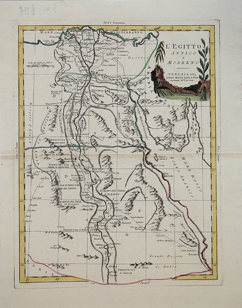 Carta geografica tratta dall’Atlante novissimo, illustrato ed accresciuto sulle osservazioni e scoperte fatte dai più celebri e più recenti geografi. Stampato in quattro volumi da Antonio Zatta tra il 1779 ed il 1785. Atlante fra i più belli e completi mai pubblicati in Italia nel XVIII secolo, l'opera più famosa dello Zatta. L’Atlante Novissimo, come si specifica anche nel titolo, è “accresciuto sulle osservazioni scoperte fatte dai più celebri e più recenti geografi”. Tra le novità più significative vi è la comparsa delle nuove isole scoperte nell'Oceano Pacifico da James Cook e la prima carta italiana della Nuova Zelanda. Le illustrazioni furono ' ideate e disegnate dai suoi collaboratori Giovanni Marco Pitteri, Anton Friedrich Busching, Pietro Antonio Novelli ed incise da Giuliano Zuliani. Il primo tomo dell’atlante è introdotto da un breve saggio di geografia generale dove l’autore definisce in modo sintetico e preciso gli elementi che compongono i reticoli eclittico ed equatoriale usati nelle tavole. Interessante la sezione dove si sofferma ' a descrivere il fenomeno della precessione degli equinozi e quello della variazione ciclica dell'obliquità dell'eclittica. Acquaforte, stampata su carta vergata coeva, coloritura coeva dei contorni, in buone condizioni. Decorative map of Egypt from the Red Sea and Nubian Desert to the Mediterranean, showing the course of the Nile to Aswan.Highly detailed and interesting. Decorative title cartouche. Map from the Atlante novissimo, illustrato ed accresciuto sulle osservazioni e scoperte fatte dai più celebri e più recenti geografi. Printed in four volumes by Antonio Zatta between 1779 and 1785. ' Atlas among the most beautiful and complete ever published in Italy in the eighteenth century, the most famous work of Zatta. The Atlante Novissimo, as also specified in the title, is “increased on the observations made by the most famous and most recent geographers”. Among the most significant innovations there is the appearance of the new islands discovered in the Pacific Ocean by James Cook and the first Italian map of New Zealand. The illustrations were designed and drawn by his collaborators Giovanni Marco Pitteri, Anton Friedrich Busching, Pietro Antonio Novelli and engraved by Giuliano Zuliani. The first volume of the atlas is introduced by a brief essay of general geography where the author defines in a concise and precise way the elements that make up the ecliptic and equatorial grids used in the tables. Interesting is the section where he pauses to describe the phenomenon of precession of the equinoxes and the cyclical variation of the obliquity of the ecliptic. Etching, printed on contemporary laid paper, contemporary outline coloring, in good condition. Cfr.
