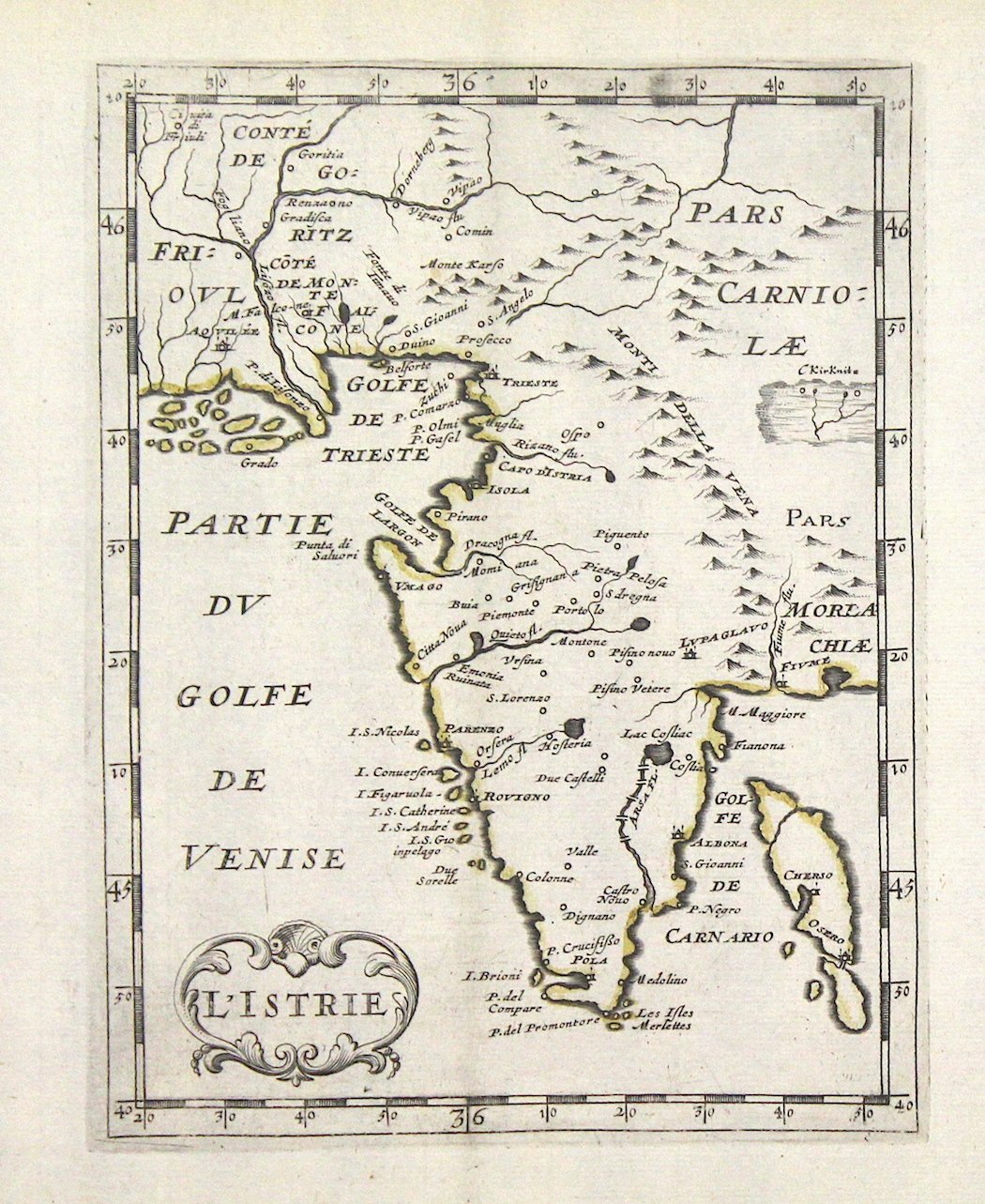 Incisione in rame con leggera coloritura antica dei confini, mm 194x150.<BR>Carta del territorio istriano con parte del golfo di Venezia. Il titolo della carta è inciso in un sobrio cartiglio decorato. Ottimo esemplare marginoso.