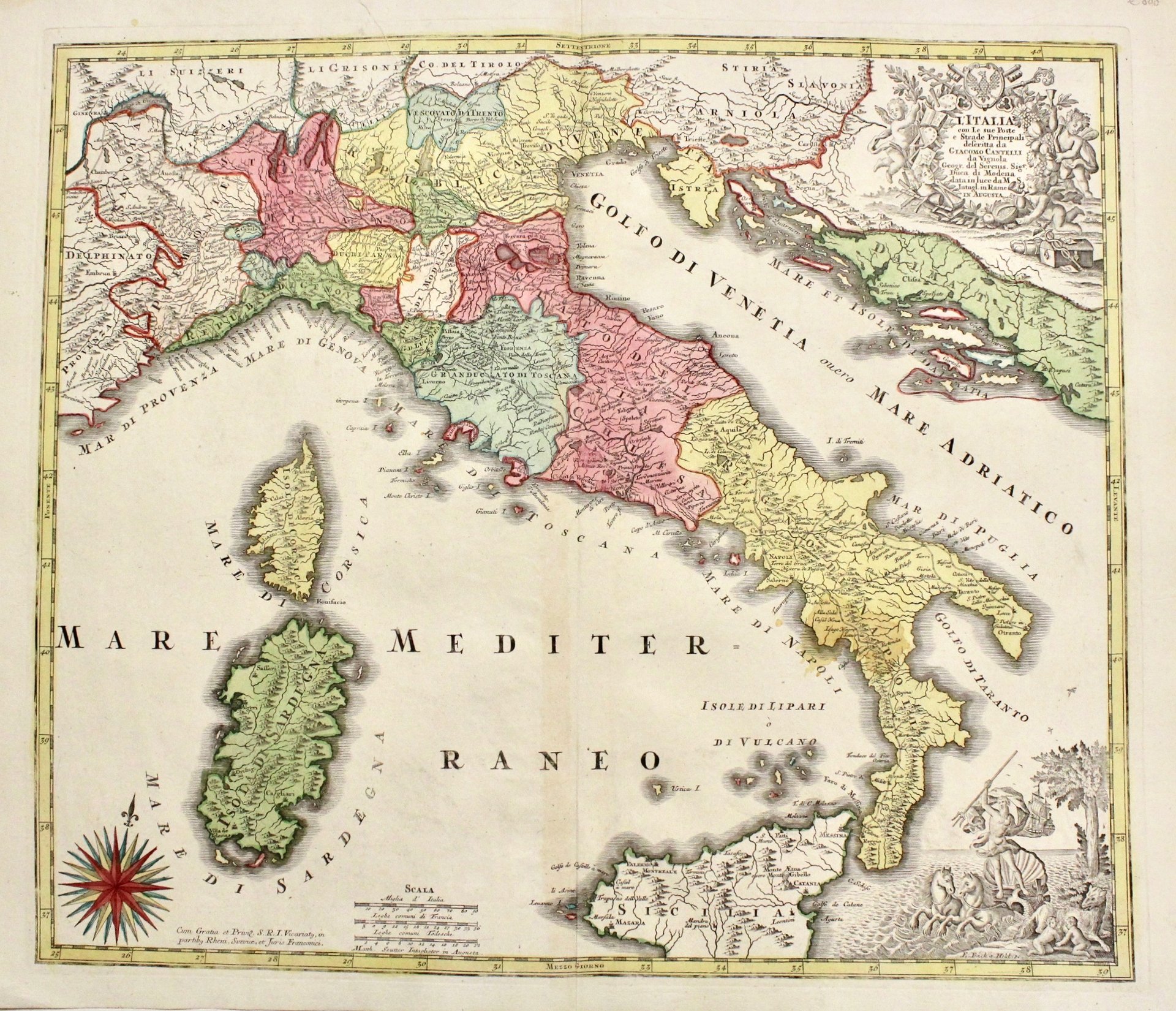 Incisione in rame, colorata a mano d’epoca, mm 500x580. Decorativa carta geografica derivata da quella di Giacomo Cantelli, geografo del Duca di Este, pubblicata originariamente a Roma da De Rossi nel 1695. Matthaeus Seutter (1678-1757), dopo un apprendistato presso Homann a Norimberga, si trasferì ad Augsburg verso il 1720 dove aprì la propria attività superando il maestro sotto il profilo della bellezza: le sue carte hanno sempre colori brillanti e cartigli elaborati. Infatti sono presenti due bei cartigli decorati con varie raffigurazioni allegoriche negli angoli di destra. Ottimo esemplare in bella vivace coloritura con traccia di pieghe orizzontali al centro. alone fra Calabria e Basilicata.