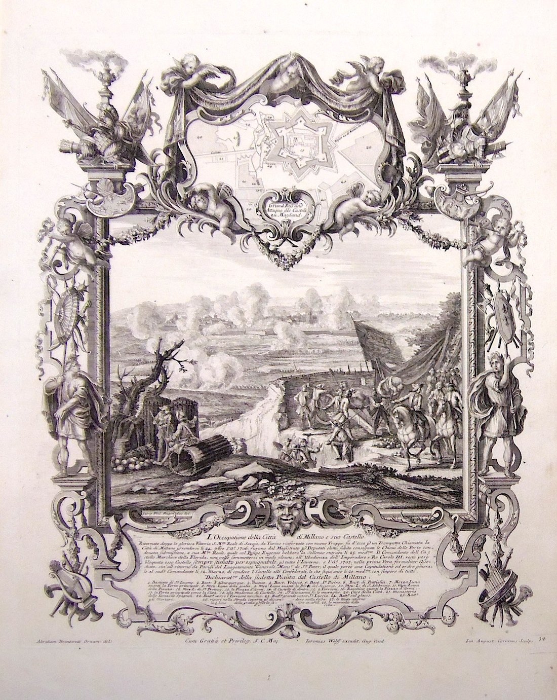 Incisione in rame eseguita da J. A. Corvinus su soggetto di Georg Philippe Rugendas, mm 453x388. Veduta di Milano con in primo piano una animata scena militare con soldati sabaudi durante l'assedio e la città bombardata sullo sfondo. Il tutto racchiuso da una ricchissima cornice ornamentale figurata. Rara stampa tratta dalla ancor più rara edizione italiana di "Representatio belli ob successionem in regno ispanico auspicis trium …Leopoldi I, Josephi I et Caroli VI intra XIV annos…", celebre opera raffigurante le battaglie e gli episodi principali della guerra di Successione spagnola. Bell'esemplare. <BR>