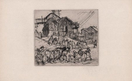 Tavola tratta da A l'ombre de la Croix Studies Of Jewish Life In The Carpathians di Frank Brangwyn, stampato da Jérôme & Jean Tharaud a Parigi, Éditions Lapina, 1931). Si tratta di un’edizione con tiratura di 222 esemplari. Impressione fine su carta giapponese, con margini, condizione perfetta. Queste 64 acqueforti e puntasecca raffigurano scene di Israele e di un villaggio nei Carpazi. Secondo 'Frank Brangwyn, a mission to decorate life (Londra: The Fine Art Society, 2006), il libro era in due volumi e descrive la vita degli ebrei nell'Europa contemporanea. Le stampe di Brangwyn illustrano la città di Belz in Polonia che era un centro di pellegrinaggio. Sembra che Brangwyn abbia inciso la maggior parte delle tavole da fotografie. Sir Frank William Brangwyn era un artista gallese, pittore, acquerellista, stampatore, illustratore e designer. Brangwyn nacque a Bruges, in Belgio, dove suo padre, William Curtis Brangwyn, si trasferì dopo aver vinto un concorso organizzato dalla corporazione belga di San Tommaso e San Luca per progettare una chiesa parrocchiale. Brangwyn era un artista di tutti i mestieri. Oltre ai dipinti e ai disegni, produsse progetti per vetri colorati, mobili, ceramiche, vetreria da tavola, edifici e interni, fu litografo e illustratore di libri. Bibliografia W. Gaunt, The etchings of Frank Brangwyn, non descritte. Plate taken from the Frank Brangwyn’s A l’ombre de la Croix, Studies Of Jewish Life In The Carpathians by Jérôme & Jean Tharaud (Paris: Éditions Lapina, 1931) edition of 222. Fine impression on Japan paper, with margins, perfect condition. ' These 64 etchings and drypoints are from Anglo-Welsh artist, painter, engraver, and illustrator Frank Brangwyn's ' depict scenes from Israel and a village in Carpathian Mountains. According to 'Frank Brangwyn, a mission to decorate life' (London: The Fine Art Society, 2006), the book was in two volumes and describes the lives of Jewish in contemporary Europe. Brangwyn's prints illustrate the town of Belz in Poland which was a centre of pilgrimage. Brangwyn seems to have etched a majority of the plates from photographs. ' Sir Frank William Brangwyn was a Welsh artist, painter, watercolourist, printmaker, illustrator, and designer. Frank Brangwyn was born in Bruges, Belgium where his father, William Curtis Brangwyn, moved after winning a competition organised by the Belgian Guild of St Thomas and St Luke to design a parish church. Brangwyn was an artistic jack-of-all-trades. As well as paintings and drawings, he produced designs for stained glass, furniture, ceramics, table glassware, buildings and interiors, was a lithographer and woodcutter and was a book illustrator. Bibliografia W. Gaunt, The etchings of Frank Brangwyn, non descritte. Cfr.
