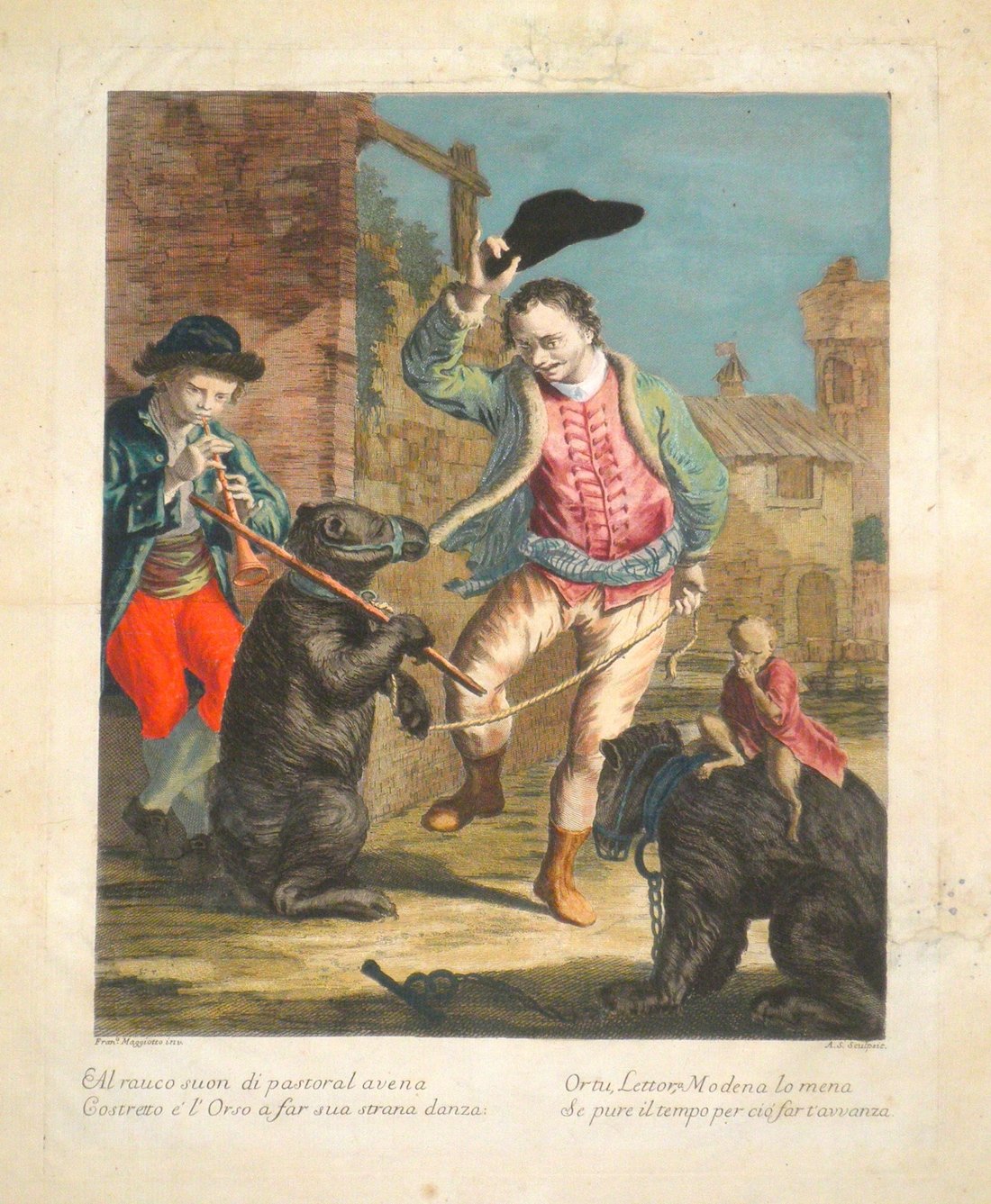 Acquaforte, mm 380x300, da soggetto di Franco Maggiotto, in rara coloritura d’epoca. Firmato in lastra "Fran.o Maggiotto inv." e "A.S. Scuplsit". La nota editoriale originale venne sostituita anche se Antonio Suntach ristampò solo le lastre incise da Volpato. Incisione dalla serie Arti per via, composta da 12 tavole. Volpato, nativo di Bassano (1740-Roma 1803) fu uno dei più validi incisori della stampa decorativa veneta del '700; raffigurò sempre con sapienza e vividezza scene di ambiente popolare, ma si dedicò anche all' incisione di capricci architettonici e delle celebri logge di Raffaello al Vaticano. Una fra i più noti e particolari soggetti del Volpato. Esemplare in buono stato di conservazione, buoni margini (mm 430x370 il foglio); uno strappo restaurato a destra in piccola parte nell’inciso ed uno al limite della battuta del rame in alto, alcune macchiette. Stato II/III. Succi, La Serenissima nello specchio di rame, pag. 775, Volpato 7.