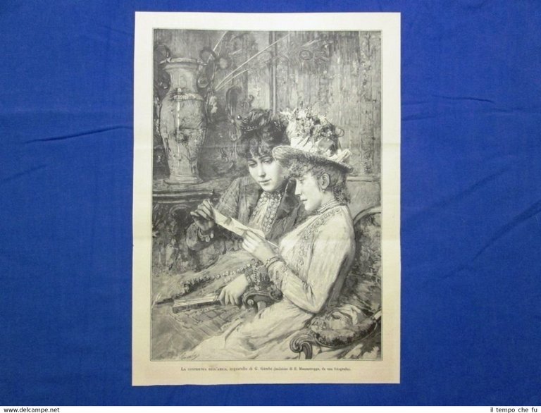 Rara Incisione Estratta da Rivista d'epoca del 1889.incisione che ha quindi oltre 125 anni! La confidenza dell'amica, acquerello di G. Gamba II1889-05 Dimensioni Cm 23,00 x 32,00 Qualora vogliate delle scansioni migliori contattateci, soddisferemo ogni vostra richiesta. PaypalCarta di creditoBonifico bancario Accuratamente adagiate su un cartoncino e protette da pellicola trasparente rigida,il tutto viene inserito dentro plico di adeguate dimensioni per proteggerne l'integrità.