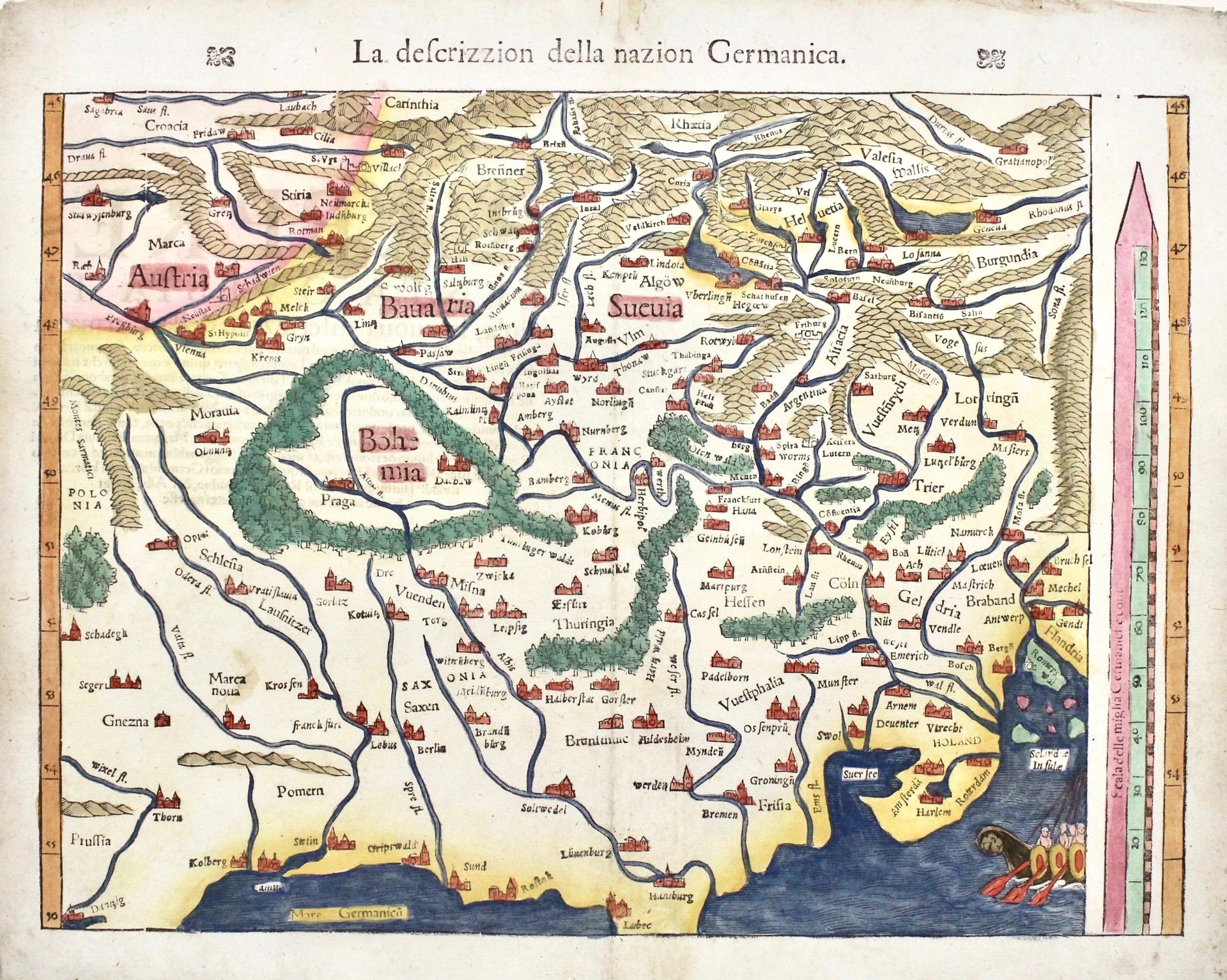 Incisione in legno, mm 255x 345, dipinta a mano. Interessante mappa della Germania. Qualche piccolo restauro alla piega centrale e forellino. Münster fu un brillante polimatico e uno dei più importanti intellettuali dell'epoca rinascimentale. Formatosi a Tubinga, i suoi quaderni universitari sopravvissuti, il Kollegienbuch, rivelano una mente dalla curiosità insaziabile, soprattutto per quanto riguarda la cosmografia. In seguito Münster divenne professore di ebraico a Heidelberg e poi, dal 1529, all'Università di Basilea. Negli anni Trenta del Quattrocento si dedicò alla traduzione della Geografia di Tolomeo, aggiungendo nuovo materiale relativo alle nuove terre scoperte in Africa, nelle Americhe e in Asia. Il risultato fu la pubblicazione della sua apprezzata Geographia Universalis, stampata per la prima volta nel 1540. Fu anche un innovatore per quanto riguarda il design e l'impaginazione delle mappe, e fu uno dei primi a creare uno spazio sui suoi blocchi di legno per l'inserimento dei nomi dei luoghi in caratteri metallici.Invia<BR>