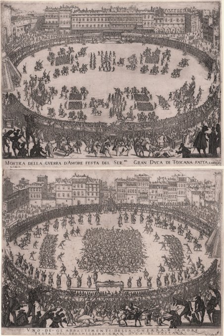 Coppia di incisioni ad acquaforte e bulino, 1615, firmate e datate in lastra in basso. Esemplari nel secondo stato di tre, classificati dal Lieure come molto rare. Magnifice prove, impresse su carta vergata coeva con filigrana con “orso”, (Lieure 16, indicata come tipica di questi lavori), rifilate al rame o con sottili margini, in ottimo stato di conservazione. Le opere raffigurano la festa del carnevale organizzata in piazza Santa Croce a Firenze nel febbraio del 1615. Traducono il genio artistico di Giulio Parigi, architetto di corte dei Medici, ideatore e organizzatore delle feste e degli sfarzosi eventi di corte, e furono pubblicate con i versi del poeta Andrea Salvadori in Guerra d'amore Festa del Serenissimo Gran Duca di Toscana, Cosimo Secundo, fatta in Firenze il Carnevale del 1615. Il tema della festa era la competizione tra Cosimo II e Lorenzo de’ Medici, che interpretano i due attori principali. I protagonisti sono raffigurati all’interno di un’arena temporanea allestita nella piazza, dove si svolge un combattimento tra le due fazioni. La storia è accompagnata dalla disputa tra Venere e Marte, con il trionfo di Venere che intona un canto in onore della pace e dell’amore. Sebbene basata su disegni preparatori di Giulio Parigi, le due composizioni furono studiate e preparate da Callot attraverso propri disegni preparatori. Le numerose figure presenti nelle due lastre, in seguito, fornirono l’ispirazione e furono riprese per i Balli di Sfessania (Lieure 379-402) e nei Tre Pantaloni (Lieure 288-290). Rare ed importanti opere. Bibliografia G. G. Bertelà & A. P. Tofani, Feste e Apparati Medicei da Cosimo I a Cosimo II pp. 142-149 & 226; Lieure 170, 171; H. Diane Russell, Jacques Callot prints & Related Drawings pp. 60-62, 49-52; Reed & Wallace, Italian Etchers of the Renaissance & Barocque pp. 222, 112. Pair of etchings with engraving, 1615, signed and dated in the plate at the bottom. Examples in the second state of three, classified by Lieure as “very rare”. Beautiful impressions, printed on contemporary laid paper with watermark "bear" (Lieure 16, indicated as typical of these works), trimmed to the platemark or with thin margins, in excellent condition. The works depict the feast of carnival organized in Piazza Santa Croce in Florence in February 1615. Translate the artistic genius of Giulio Parigi, architect of the court of the Medici, founder and organizer of festivals and glitzy events at court and were published with the verses of the poet Andrea Salvadori in Guerra d'amore Festa del Serenissimo Gran Duca di Toscana, Cosimo Secundo, fatta in Firenze il Carnevale del 1615. The theme of the festival was the competition between Cosimo and Lorenzo II de 'Medici, who play the two main actors. The main characters are portrayed in a temporary arena set up in the square, the location of a battle between the two factions. The story is accompanied by a dispute between Venus and Mars, with the triumph of Venus who sings a song in honor of peace and love. Although based on preparatory drawings by Giulio Parigi, the two compositions were designed and prepared by Callot through their preparatory drawings. The numerous figures in the two plates later provided an inspiration and were taken to the Dances of Sfessania (Lieure 379-402) and in the Three Pants (Lieure 288-290). Rare and important works. Bibliografia G. G. Bertelà & A. P. Tofani, Feste e Apparati Medicei da Cosimo I a Cosimo II pp. 142-149 & 226; Lieure 170, 171; H. Diane Russell, Jacques Callot prints & Related Drawings pp. 60-62, 49-52; Reed & Wallace, Italian Etchers of the Renaissance & Barocque pp. 222, 112. Cfr.