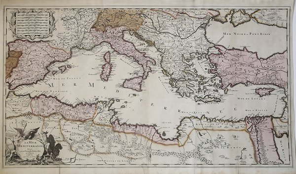Rara carta del Mediterraneo in due fogli di Gerard Valck, stampata ad Amsterdam alla fine del XVII secolo. Carta geografica pubblicata ad Amsterdam da Gerard e Leonard Valck, padre e figlio, ai primissimi del Settecento all'interno del loro ' Atlantis sylloge compendiosa or Nova totius Geographia. ' Di questo atlante, poco noto, si conoscono varie edizioni pubblicate tra il 1702 e il 1710 con un numero di carte variabile da 20 a 100. Si trova anche in: ' Nieuwe Atlas. di Johannes Covens e Cornelis Mortier del 1740 ?. Gerard o Gerrit Valck, o Valk o Valcke o Walck (Amsterdam, 1651 o 1652 – Amsterdam, 21 ottobre 1726), è stato un incisore, disegnatore, cartografo e mercante d'arte olandese. Si dedicò principalmente alla rappresentazione di soggetti di genere e alla realizzazione di ritratti. Collaborò con Abraham Bloteling, David Loggan, Peter Schenk (dal 1686) e, successivamente, con il figlio di quest'ultimo, Leonard e con il proprio figlio Leonard Valck (1675-1746). Pubblicò anche atlanti, carte geografiche, globi e serie di stampe con vedute di case della famiglia Orange-Nassau, mestieri, fontane, camini e uccelli. A partire dal 1695, per le sue stampe topografiche, utilizzò la tecnica di incisione ' a la poupée, che permetteva di realizzare stampe multicolori. Il 24 settembre di quell'anno, infatti, ottenne, assieme a Peter Schenk, un privilegio per poter eseguire stampe in bianco e nero e a colori. Per le sue stampe, però, non utilizzò solo lastre da lui incise, ma acquistò anche stampi di rame da altri editori, quali Johannes Blaeu e Nicolaes Visscher. Acquaforte con coloritura editoriale, in ottimo stato di conservazione. Rara. The map extends from the Straits of Gibraltar to Cypress and Haifa. Includes an allegorical title cartouche. Carta geografica pubblicata ad Amsterdam da Gerard e Leonard Valck, padre e figlio, ai primissimi del Settecento all'interno del loro ' Atlantis sylloge compendiosa or Nova totius Geographia. ' Di questo atlante, poco noto, si conoscono varie edizioni pubblicate tra il 1702 e il 1710 con un numero di carte variabile da 20 a 100. Si trova anche in: ' Nieuwe Atlas. di Johannes Covens e Cornelis Mortier del 1740 ?. Gerard o Gerrit Valck, o Valk o Valcke o Walck (Amsterdam, 1651 o 1652 – Amsterdam, 21 ottobre 1726), è stato un incisore, disegnatore, cartografo e mercante d'arte olandese. Si dedicò principalmente alla rappresentazione di soggetti di genere e alla realizzazione di ritratti. Collaborò con Abraham Bloteling, David Loggan, Peter Schenk (dal 1686) e, successivamente, con il figlio di quest'ultimo, Leonard e con il proprio figlio Leonard Valck (1675-1746). Pubblicò anche atlanti, carte geografiche, globi e serie di stampe con vedute di case della famiglia Orange-Nassau, mestieri, fontane, camini e uccelli. A partire dal 1695, per le sue stampe topografiche, utilizzò la tecnica di incisione ' a la poupée, che permetteva di realizzare stampe multicolori. Il 24 settembre di quell'anno, infatti, ottenne, assieme a Peter Schenk, un privilegio per poter eseguire stampe in bianco e nero e a colori. Per le sue stampe, però, non utilizzò solo lastre da lui incise, ma acquistò anche stampi di rame da altri editori, quali Johannes Blaeu e Nicolaes Visscher. Acquaforte con coloritura editoriale, in ottimo stato di conservazione. Rara. Cfr.