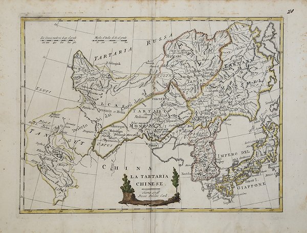 Carta tratta dalla rara raccolta di carte geografiche denominata Atlante Geografico, prima stesura delle opera dell’abate Bartolomeo Borghi, pubblicata in Siena dal Pazzini Carli. Molte delle carte, datate tra il 1788 ed il 1800, sono incise da Agostino Costa e poi successivamente inserite nell’opera Atlante generale dell'ab. Bartolommeo Borghi, pubblicato a Firenze nel 1819.Bartolomeo Borghi, che Vermiglioli (Biografia degli scrittori perugini, 1829) definisce "uno dei migliori geografi dell'Europa", nacque nel 1750 a Monte del Lago, piccola frazione del comune di Magione, in provincia di Perugia, sulle rive del Trasimeno. Ordinato sacerdote nel 1774, trascorse i primi anni del suo mandato nel paese natale, poi a Magione e quindi a Sorbello (Cortona).Appassionato studioso di geografia, applicò dapprima le sue conoscenze all'analisi delle terre a lui più familiari: nel 1770 scrisse Descrizione geografica, fisica e naturale del Lago Trasimeno (che sarà tuttavia data alle stampe per la prima volta solo nel 1821), e nel 1791 pubblicò negli atti dell'Accademia etrusca di Cortona una Dissertazione sopra l'antica geografia dell'Etruria, Umbria e Piceno, arricchendo entrambe le opere di una carta delle regioni descritte. Intanto la sua fama di cartografo, oltre che di geografo, cresceva, tanto da fargli ottenere le nomine a membro delle Accademie Cortonese e Reale di Firenze, e procurargli l'incarico, da parte di Pietro Leopoldo, di delineare la carta del catasto pubblico di Cortona e del contado di Castiglione.Nello stesso tempo gli orizzonti geografici della sua attività si allargavano sensibilmente, e se nell'Atlante Novissimo, illustrato ed accresciuto sulle osservazioni, e scoperte fatte dai più celebri e più recenti cartografi di Antonio Zatta (Venezia 1779-1785) il suo contributo fu ancora legato all'area toscana, nell'Atlante geografico che si pubblicò a Siena da Pazzini Carli tra il 1798 ed il 1800 il Borghi tracciò la maggior parte delle carte e spaziò dalle province del Sud-Est dell'Inghilterra, al Regno di Danimarca, alla Romania.Una sorta di prova generale, quest'ultima, della sua opera più importante, quell'Atlante generale dell'ab. Bartolommeo Borghi, pubblicato a Firenze nel 1819. L'Atlante, corredato da brevi descrizioni storiche, politiche, civili e naturali che introducono le carte relative ai territori afferenti a ciascun Impero o Regno illustrato, rispecchia il nuovo assetto geo-politico attuato dal Congresso di Vienna.Incisione in rame, bella coloritura coeva, in ottimo stato di conservazione. Map taken form the very rare Atlante Geografico, the first draft of the abbot Bartolomeo Borghi, published in Siena by Pazzini Carli. Many of the mapss, dated between 1788 and 1800, are engraved by Agostino Costa and then later incorporated in the work of AB Atlante Generale di Bartolomeo Borghi, published in Florence in 1819.Bartolomeo Borghi, who Vermiglioli (Biography of writers Perugini, 1829) calls "one of the best geographers of Europe", was born in 1750 in Monte del Lago, a small fraction of the town of Mansfield, in the province of Perugia, on the shores of Lake Trasimeno. Ordained in 1774, spent the first years of his term in his hometown, then to Mansfield and then Sorbello (Cortona).A passionate student of geography, first applied his knowledge to the analysis of land more familiar to him: he wrote in 1770 Description geographical, physical and natural Lake Trasimeno (which will however be given to the press for the first time only in 1821), and 1791 published in the Proceedings of Etruscan Cortona a dissertation on the geography of ancient Etruria, Umbria and Piceno, enriching both the works of a map of the regions described. Meanwhile, his fame as a cartographer, as well as a geographer, was growing, so that he get the nomination as a member of the Royal Academies of Florence and Cortona, and give him the job, by Pietro Leopoldo, to outline the paper's public land Cortona and the county of Castiglione.At the same time the geographical horizons of its activities widened considerably, and if in the Atlas Novissimo, illustrated and amplified the observations and discoveries made by the most recent and most famous cartographer Antonio Zatta (Venice 1779-1785) his contribution was still related area of Tuscany, in the Atlas geographic monthly published in Siena by Pazzini Carli between 1798 and 1800 the villages drew most of the cards and spaced from the provinces of South-East of England, the Kingdom of Denmark, Romania.A sort of dress rehearsal, the latter, his most important work, quell'Atlante General of AB. Bartolomeo Borghi, published in Florence in 1819. The Atlas, accompanied by brief descriptions of historical, political, civil and natural to introduce the papers relating to the territories belonging to each United Empire or illustrated, reflects the new geo-political structure implemented by the Congress of Vienna. Cfr.