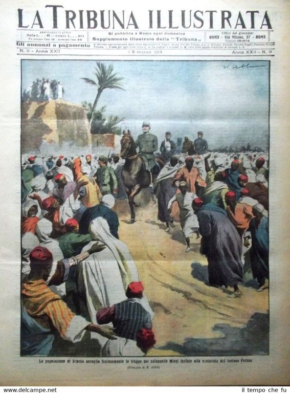 La Tribuna Illustrata Rivista originale del 1-8 Marzo 1914 Anno 22- N. 9 Rarità per appassionati e collezionisti Seguono solo alcuni dei fatti descritti, illustrati e fotografati all'interno Illustrato in copertina (segue foto): La popolazione di Sebeha accoglie festosamente le truppe del colonnello Miani inviate alla conquista del lontano Fezzan Illustrato nella retro copertina (segue foto): Occupata ed incendiata dopo una lotta ostinata la Zavia Argub, covo di ribelli, i prigionieri vennero condotti al campo di Bengasi sotto la scorta degli alpini del battaglione Ivrea Nelle pagine interne: Alla camera dei deputati di Francia, la questione degli indigeni. Scuole di vita: di grazia e di forza. Moda: tiranna del mondo. I 508 nelle maschere di Girus (XVI serie). Cura dei disturbi della favella. Piccola cronaca illustrata della settimana. .e tanto altro ancora! Qualora vogliate maggiori delucidazioni contattateci In questo negozio troverai un'intera categoria dedicata alle Tribune Illustrate, sotto il link diretto alla collezione: Riviste disponibili Cliccaci sopra, troverai di certo ciò che cerchi! La Tribuna Illustrata fu un settimanale italiano pubblicato a Roma. Insieme a La Domenica del Corriere e a L'Illustrazione Italiana fu il settimanale illustrato preferito dagli Italiani nel periodo che intercorse dalla fine dell'800 all'avvento della televisione. Fondato nel 1890 come supplemento del quotidiano La Tribuna, il primo numero uscì il 6 gennaio, il formato della rivista era cm 27 x 38, un formato poco più grande del tabloid. La prima ed ultima pagina erano a colori, disegnate da pittori e incisori affermati. Ogni numero conteneva 16 pagine. I principali collaboratori furono: Luigi Capuana, Adolfo De Bosis, Alfredo Fabrizi, Gandolin, Giuseppe Giacosa, Attilio Luzzato, Enrico Panzacchi, Rastignac, Attilio Sarfatti, Armand Silvestre, Ettore Socci, Gaspare Ungarelli, Pio Vanzi, Annie Vivanti. Il Corredo iconografico fu di prim'ordine. I principali pittori, disegnatori ed illustratori furono: Basilio Cascella e i figli Tommaso e Michele, Enrico Lionne, Aleardo Terzi, Augusto Bompiani, Roberto Bompiani, Domenico Bruschi, Modesto Faustini, Rubens Santoro, Rafael Senet, Cesare Tiratelli. Tra i romanzi a puntate che vi uscirono ricordiamo: L'invincibile, di Gabriele D'Annunzio Una giovinezza, di Francois Coppée e Zia Aurelia di André Theuriet, questi ultimi due entrambi illustrati da Emile Bayard. Paypal Carta di credito Bonifico bancario Spedizione con posta ordinaria o raccomandata scelta dall'acquirente nel momento del pagamento