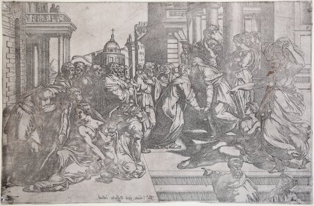 Acquaforte, metà del XVI secolo, firmata in lastra in basso al centro. Da un soggetto di Francesco Salviati. Bellissima prova, impressa su carta vergata coeva priva di filigrana, rifilata al rame, piega di carta al centro restaurata, piccoli restauri perfettamente eseguiti, nel complesso in buono stato di conservazione. Come sottolinea giustamente Adam Bartsch, le linee dell’acquaforte in alcuni punti non sono ben incise, tanto da determinare in molte impressioni dei difetti di stampa. Questo esemplare mostra alcune linee ritoccate ad inchiostro antico, particolare non inconsueto da riscontrare nelle opere del Passarotti. L’incisione riproduce in controparte un affresco di Francesco Salviati (1510 – 1563) del 1538 in S. Giovanni Decollato, a Roma. Dallo stesso affresco anche Giorgio Ghisi realizza un’incisione intorno al 1540, ma discostandosene in molti punti. L’opera di Passarotti risulta, invece, molto più fedele all’originale. È possibile che per l’incisione l’artista si sia basato sull’osservazione diretta dell’affresco a Roma, intorno al 1550, oppure si sia servito di un disegno preparatorio del Salviati stesso. Nel 1986, Annamaria Petrioli Tofani ha pubblicato, tra gli altri, un disegno degli Uffizi come preparatorio di Salviati per l’affresco. Se effettivamente autografo, potrebbe essere servito da modello a Passarotti. Questa è la sola incisione di Passarotti in cui è espressamente dichiarata la dipendenza da un’altra opera. Questa peculiarità può essere spiegata in due modi: la natura del modello, un famoso affresco romano, ampiamente lodato da Vasari; oppure obbediva alla richiesta di un committente. In diverse fonti si segnala che l’opera di Salviati fu incisa in rame, senza indicare anche il nome dell’artista, “a spese di Agostino Lacchetti”, di cui, tuttavia, non si trovano notizie. Etching, about 1550, signed at lower center. After Francesco Salviati. A fine impression, printed on contemporary laid paper, trimmed to the platemark, small repairs and a central fold, generally in very good conditions. As rightly pointed out by Adam Bartsch, etching lines in some places are not well recorded, so many impressions to be determined in print defects. This example shows a few lines retouched to old ink , not particularly unusual to find in the works of Passarotti. The engraving reproduces a fresco by Francesco Salviati (1538) preserved in St. Giovanni Decollato in Rome. From the same fresco Giorgio Ghisi produces an engraving around 1540. The work by Passarotti is, however, much more faithful to the original.It is possible that for etching the artist was based on direct observation of the fresco in Rome around 1550, or has served as a preparatory drawing by the same Salviati. In 1986, Annamaria Petrioli Tofani has published, among others, a preparatory drawing in the Uffizi as Salviati for the fresco. This is the only work of Passarotti in which it is expressly declared dependency on another work . This peculiarity can be explained in two ways: the nature of the model, a famous Roman fresco, widely praised by Vasari , or obeyed the request of a customer . In several sources it should be noted that the work of Salviati was engraved in copper, without indicating the name of the artist, "at the expense of Agostino Lacchetti " which , however, are not known news . Cfr. Bartsch, 2; The Illustrated Bartsch, 007; Le Blanc, vol. 2, p. 146, 3.