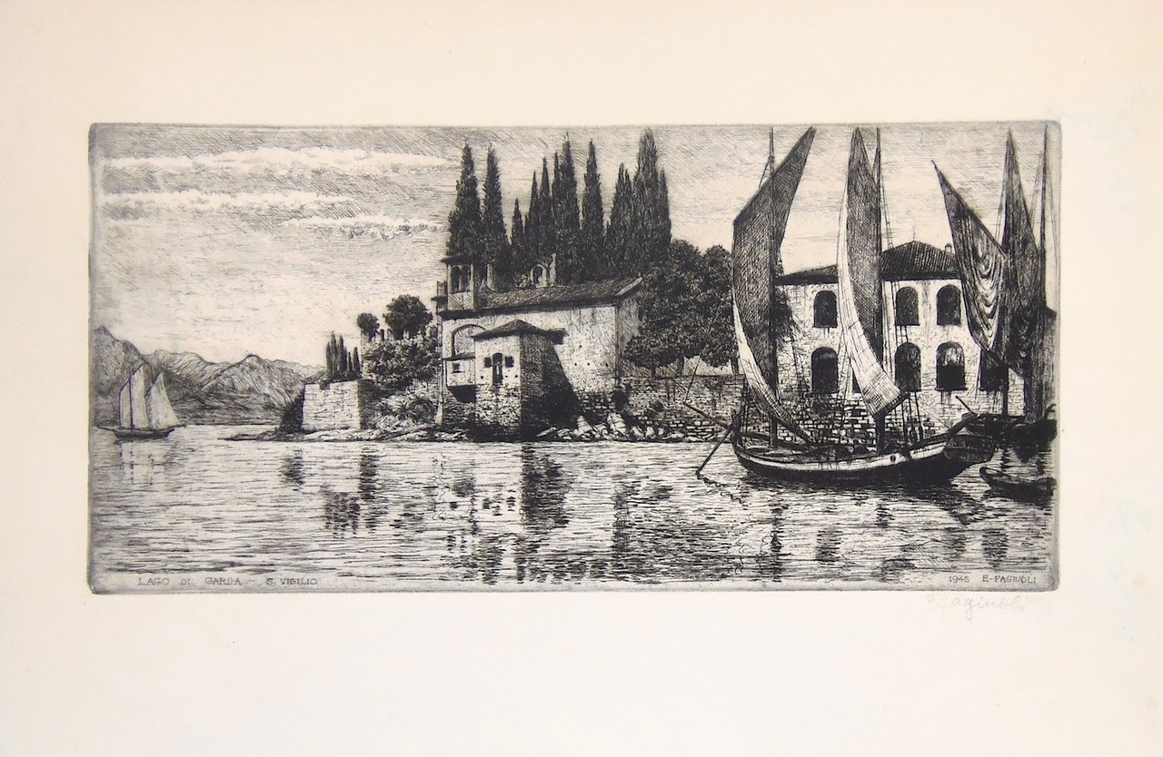 Acquaforte, mm 190x395. Rarissima incisione firmata a matita in basso a destra. Fagiuoli (18884-1961) fu assoluto protagonista della scena veronese novecentesca come architetto, scenografo e artista. Le sue acqueforti di notevole espressività grafica e stile molto personale sono senza dubbio la più fedele rappresentazione grafica della Verona della prima metà del Novecento. Il famoso architetto, autore di decine di costruzioni civili private e pubbliche, era uso incidere per diletto poche copie non numerate, che spesso regalava agli amici. Ottimo esemplare con restauri al margine destro che non intaccano l'incisione. <BR>