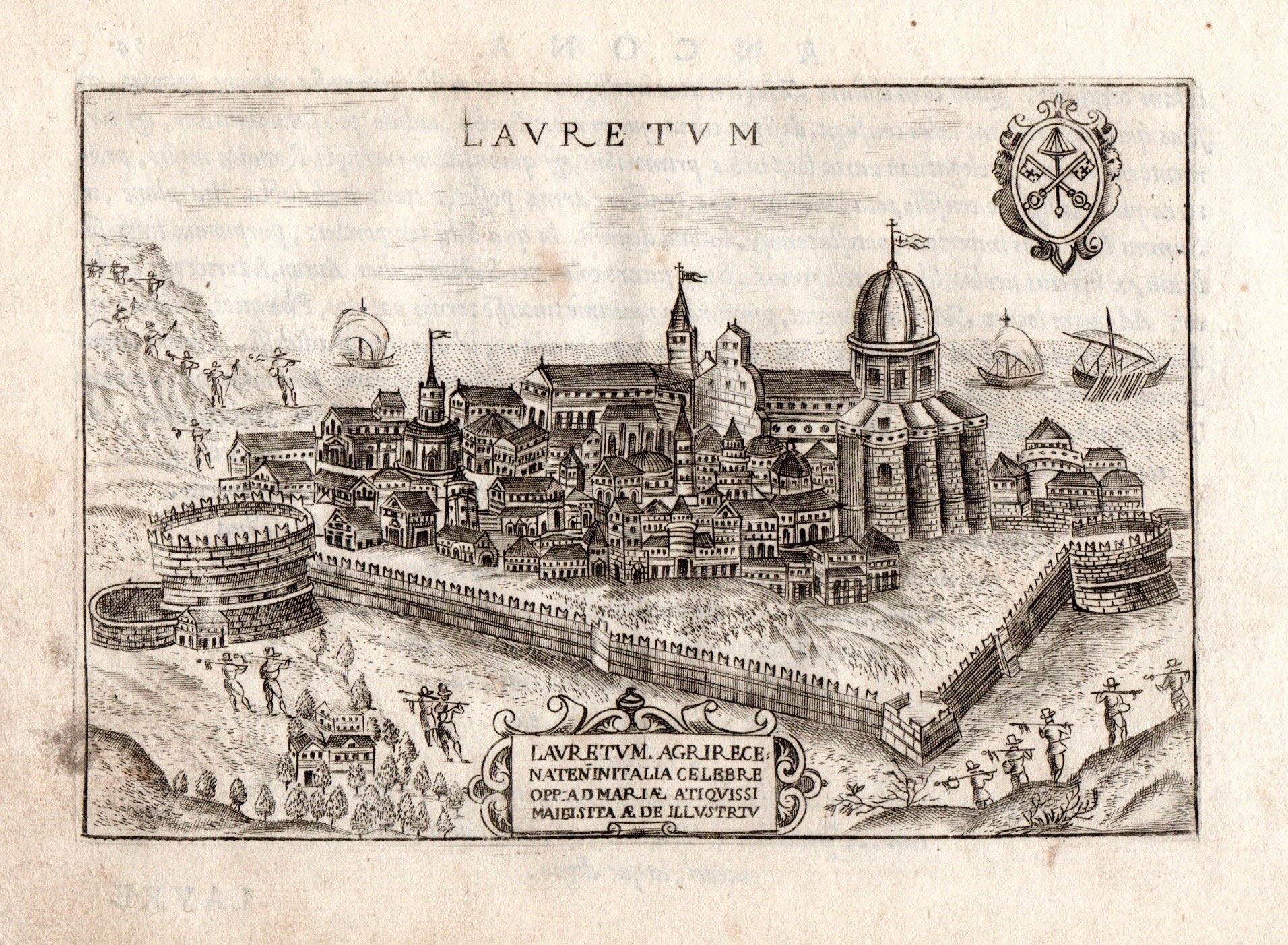 Incisione in rame, dipinta a mano, mm 120x173. Tratta da "Theatrum urbium Italicarum" prima edizione di questa raccolta di piante e vedute di città (senza dubbio da preferire per freschezza di stampa delle lastre alla successiva), ristampata successivamente a Vicenza nel 1616 da Domenico Amadio con l'aggiunta di alcune tavole (67 tavole invece delle 59 originali). Testo latino al verso, di autore ignoto, anche se alcuni studiosi ipotizzano sia dello stesso Bertelli. BUoin esemplare con tracce di sporco superficiale all'angolo inf. sin.