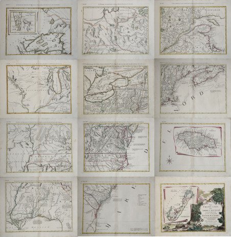 Carta geografica murale, composta da 12 fogli ancora da unire, tratta dall'Atlante Novissimo dello Zatta, pubblicato a Venezia tra il 1779 ed il 1785. La carta è basata su quella di J. Mitchell che venne usata per stabilire i confini delle colonie nel trattato di pace del 1783 di Parigi, a conclusione della Guerra di Indipendenza. La carta divenne quindi la prima mappa ufficiale degli Stati Uniti. Quella dello Zatta rappresenta la prima edizione italiana di questa leggendaria carta, realizzata nel classico stile settecentesco veneziano, includendo un cartiglio molto decorativo contenente la carta delle Bermuda. Tuttavia la carta dello Zatta presenta delle significative varianti rispetto al suo prototipo, includendo maggiori informazioni geografiche, dedotte da altre fonti cartografiche. Per esempio la Virginia deriva dalla carta di Fry e Jefferson del 1753, mentre sono indicate informazioni relative alla guerra d’indipendenza nei dintorni di Saratoga, Philadelphia e Charleston. Da ricordare inoltre che questa rappresenta una delle prime carte ad assegnare alle colonie britanniche in rivolta l’appellativo di “Colonie unite”. Incisione in rame, coloritura coeva dei contorni, 12 fogli, in eccellente stato di conservazione. Carta geografica tratta dall’Atlante novissimo, illustrato ed accresciuto sulle osservazioni e scoperte fatte dai più celebri e più recenti geografi. Stampato in quattro volumi da Antonio Zatta tra il 1779 ed il 1785. Atlante fra i più belli e completi mai pubblicati in Italia nel XVIII secolo, l'opera più famosa dello Zatta. L’Atlante Novissimo, come si specifica anche nel titolo, è “accresciuto sulle osservazioni scoperte fatte dai più celebri e più recenti geografi”. Tra le novità più significative vi è la comparsa delle nuove isole scoperte nell'Oceano Pacifico da James Cook e la prima carta italiana della Nuova Zelanda. Le illustrazioni furono ' ideate e disegnate dai suoi collaboratori Giovanni Marco Pitteri, Anton Friedrich Busching, Pietro Antonio Novelli ed incise da Giuliano Zuliani. Il primo tomo dell’atlante è introdotto da un breve saggio di geografia generale dove l’autore definisce in modo sintetico e preciso gli elementi che compongono i reticoli eclittico ed equatoriale usati nelle tavole. Interessante la sezione dove si sofferma ' a descrivere il fenomeno della precessione degli equinozi e quello della variazione ciclica dell'obliquità dell'eclittica. Acquaforte, stampata su carta vergata coeva, coloritura coeva dei contorni, in buone condizioni. Geographic wall map, made of 12 sheets yet to be joined together. Taken from Zatta’s Atlante Novissimo published in Venice between 1779 and 1785. The map is based on J. Mitchell’s, which was used to establish the borders of the colonies during the peace treaty of Paris in 1783, after the Independence War, becoming henceforth the first, official map of the United States. Zatta’s map is the first, Italian edition of this legendary map; it has been realized in the characteristic eighteenth-century Venetian style, including also a cartouche depicting the map of the Bermuda Islands. Nevertheless, the map of Zatta differs quite a lot from its prototype for it shows many geographic details which were inferred from other cartographic sources. For instance, the State of Virginia derives from the 1753 map of Fry and Jefferson, while around the cities of Saratoga, Philadelphia and Charleston there are some information about the independence war. Noteworthy is also the fact that this is one of the first maps to define the British colonies the “United Colonies”. Map from the Atlante novissimo, illustrato ed accresciuto sulle osservazioni e scoperte fatte dai più celebri e più recenti geografi. Printed in four volumes by Antonio Zatta between 1779 and 1785. ' Atlas among the most beautiful and complete ever published in Italy in the eighteenth century, the most famous work of Zatta. The Atlante Novissimo, as also specified in the title, is “increased on the observations made by the most famous and most recent geographers”. Among the most significant innovations there is the appearance of the new islands discovered in the Pacific Ocean by James Cook and the first Italian map of New Zealand. The illustrations were designed and drawn by his collaborators Giovanni Marco Pitteri, Anton Friedrich Busching, Pietro Antonio Novelli and engraved by Giuliano Zuliani. The first volume of the atlas is introduced by a brief essay of general geography where the author defines in a concise and precise way the elements that make up the ecliptic and equatorial grids used in the tables. Interesting is the section where he pauses to describe the phenomenon of precession of the equinoxes and the cyclical variation of the obliquity of the ecliptic. Etching, printed on contemporary laid paper, contemporary outline coloring, in good condition. Cfr. Sabin 68109; Stephenson, A la Carte, p. 113; cf P 650, 651. Map Forum 1, p. 58.
